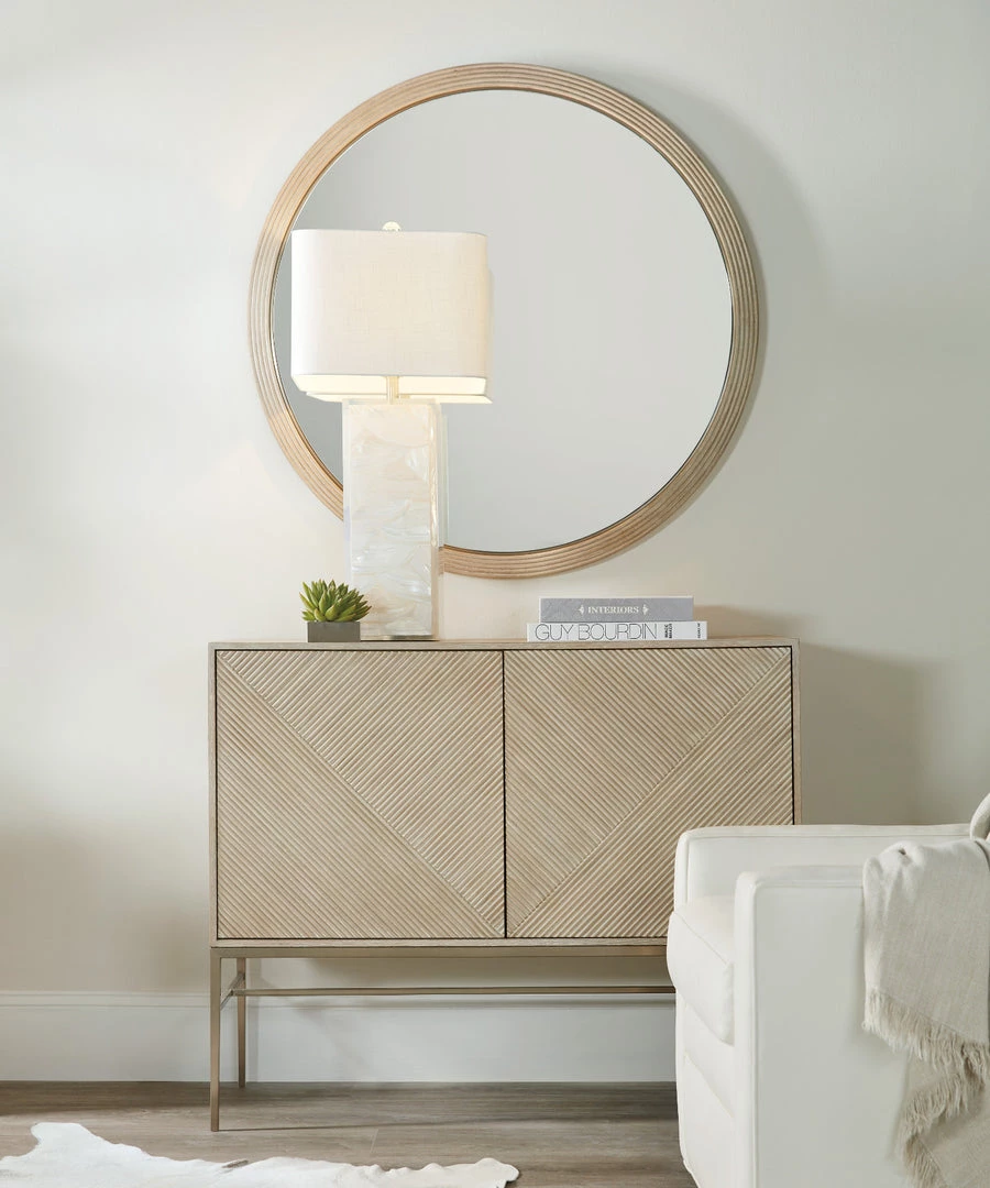 The Palisades Console invokes modern Zen with its streamlined design in a light and airy neutral color palette. Reeded door fronts add texture and create a subtle geometric pattern that centers the design of this two drawer cabinet credenza.