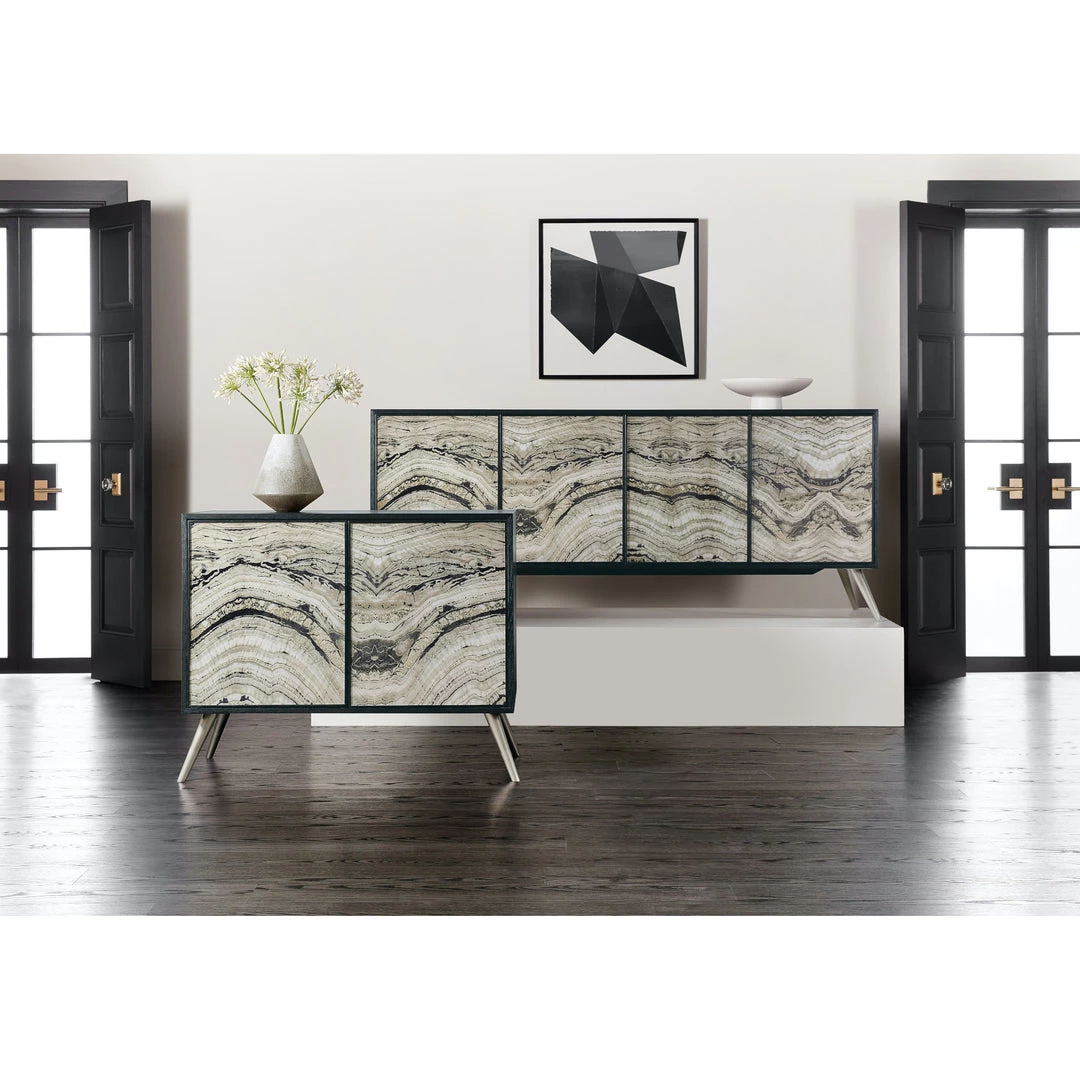 With stunning geode-patterned reverse painted glass doors in a black and ivory pattern, accented by silver metal legs, the Rockee Four-Door Credenza takes organic style to the next level. There’s one adjustable shelf behind each pair of doors. Crafted of Oak Veneers with Glass and Stainless Steel, the chest has a ventilated back panel with wire management and an FC705 three-plug outlet.