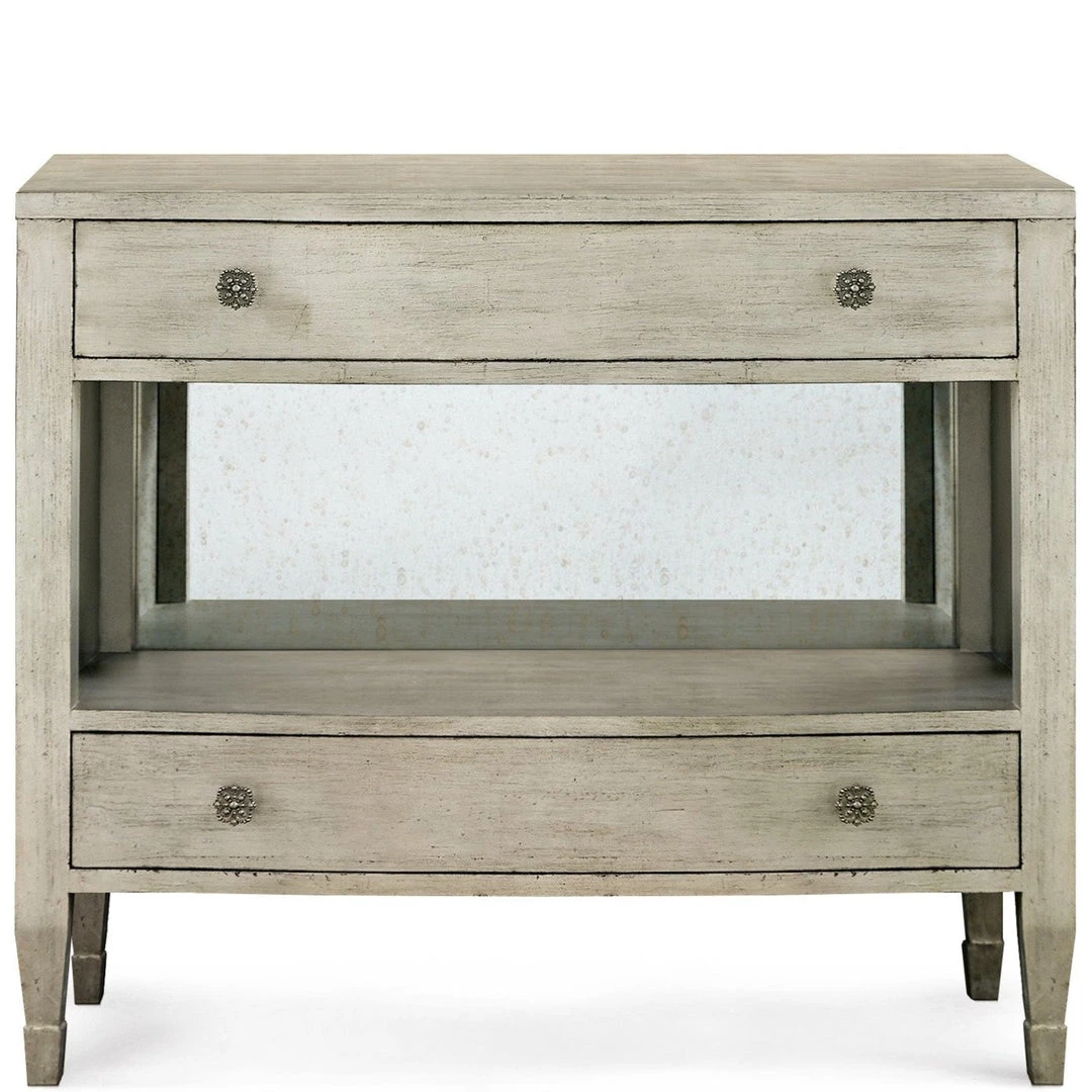 Inspired by a Parisian antique, Gemme two drawer night chest features a rustic light wood frame with eglomise mirrored back panel and antique silver decorative pulls designed to look like a piece of jewelry. The back features a hidden charging station for your electronics.
