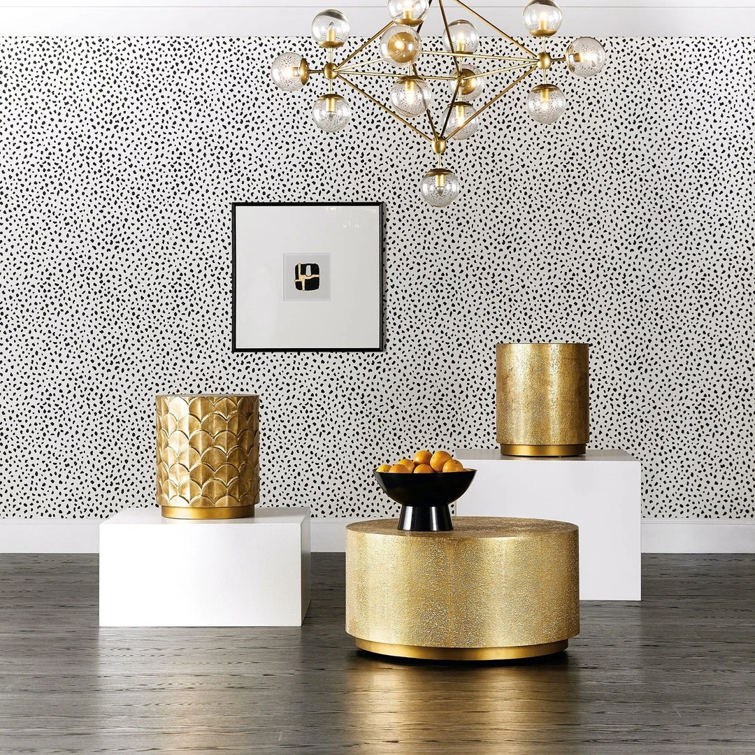 Details add depth to a deceptively simple shape. Set on a plynth base with casters for easy mobility, Gilda’s body is finished in a textured bright brass foil treatment creating a striking gold color.