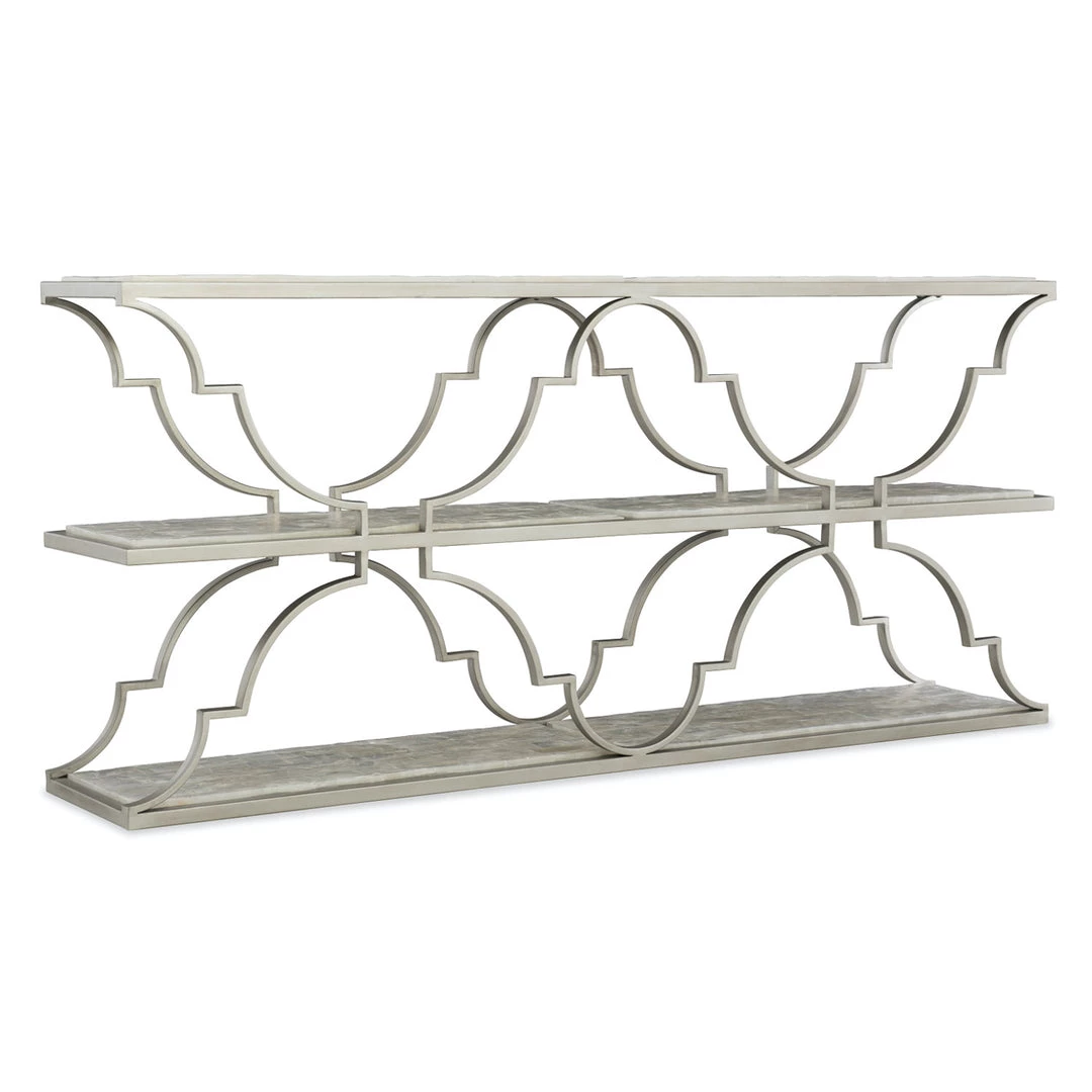 This elegant 3-tier console table’s shelves are inlayed with icy white gypsum stone brick mosaic adding instant luxury to any space.