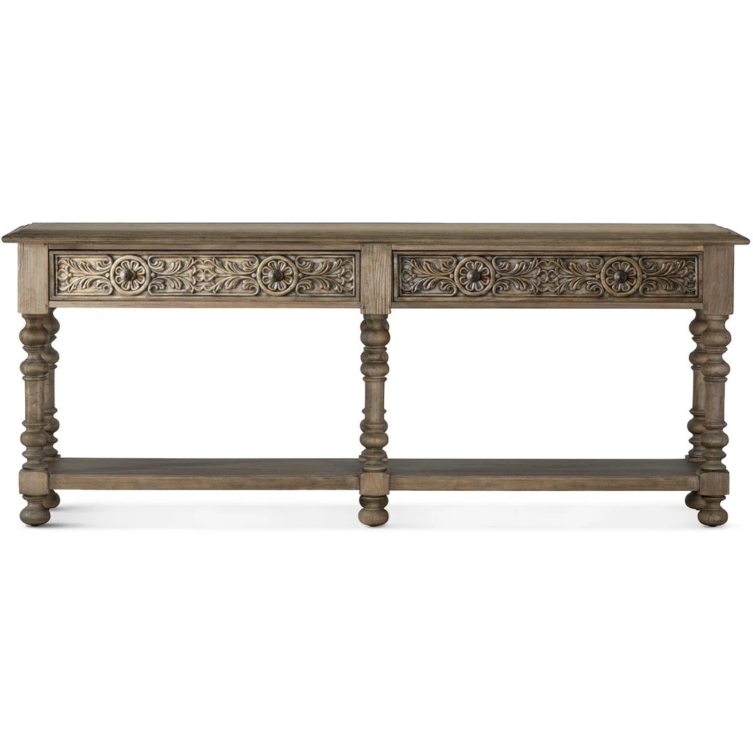 With a carved oak motif inspired by the scrub oaks that are prominent in the American West, the rustic sandstone finished Huntboard console has one fixed wood shelf and two drawers. This piece is perfect for those who want an authentic vintage farmhouse vibe.