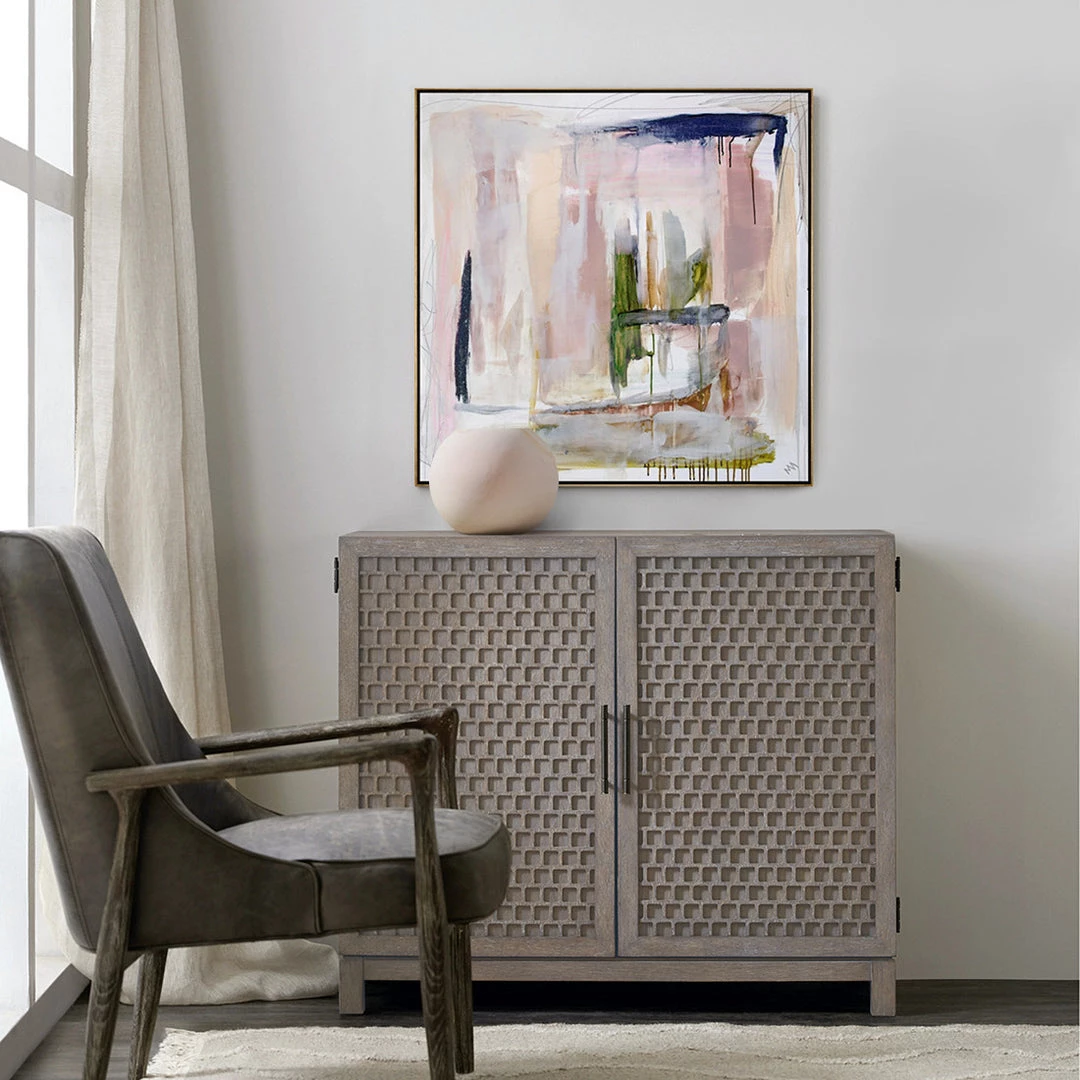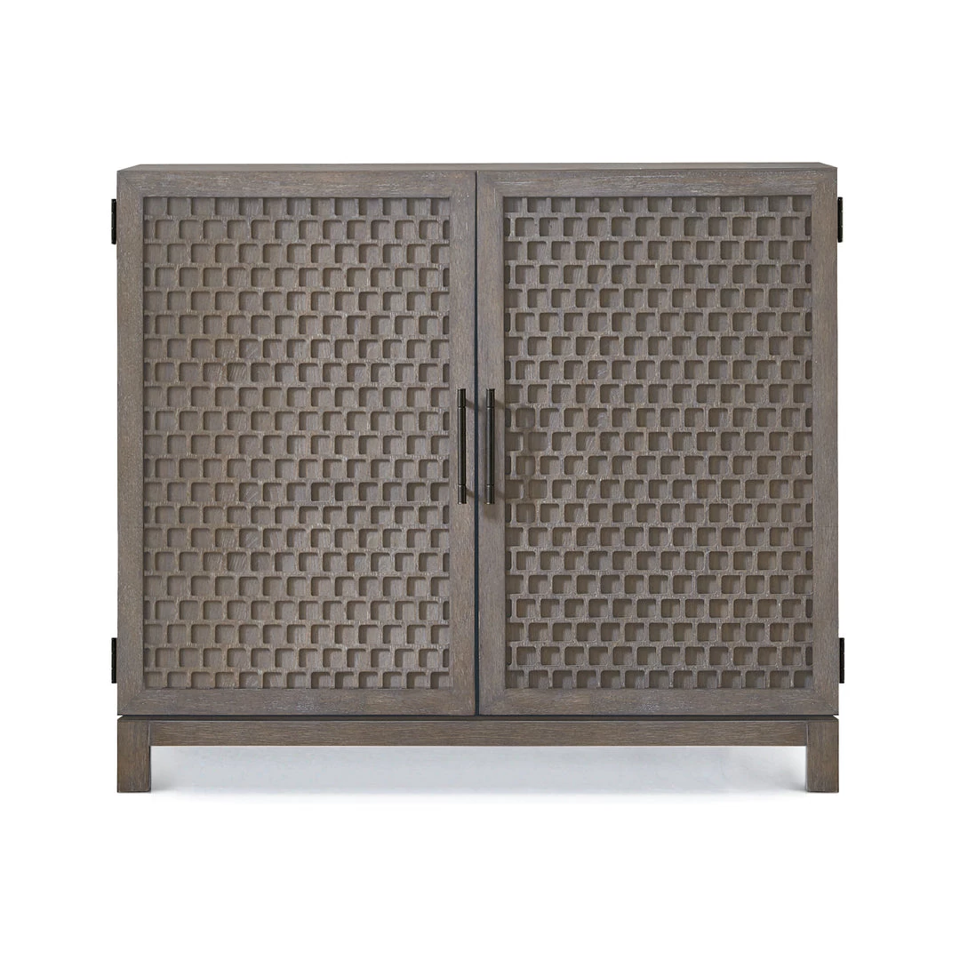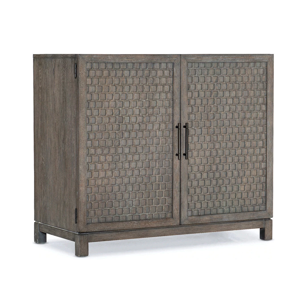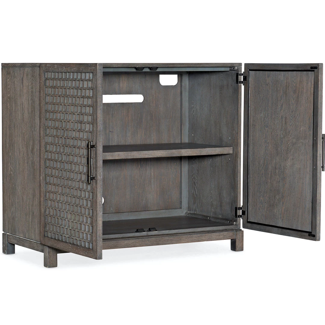 Rustic grey elm adopts intricate carved door front for a uniquely textured look with a modern touch. Spacious interior shelving for media, plus rear cutouts for cord management. Place front and center in most any hallway or living room. Top with things you love. Now that’s instant style.