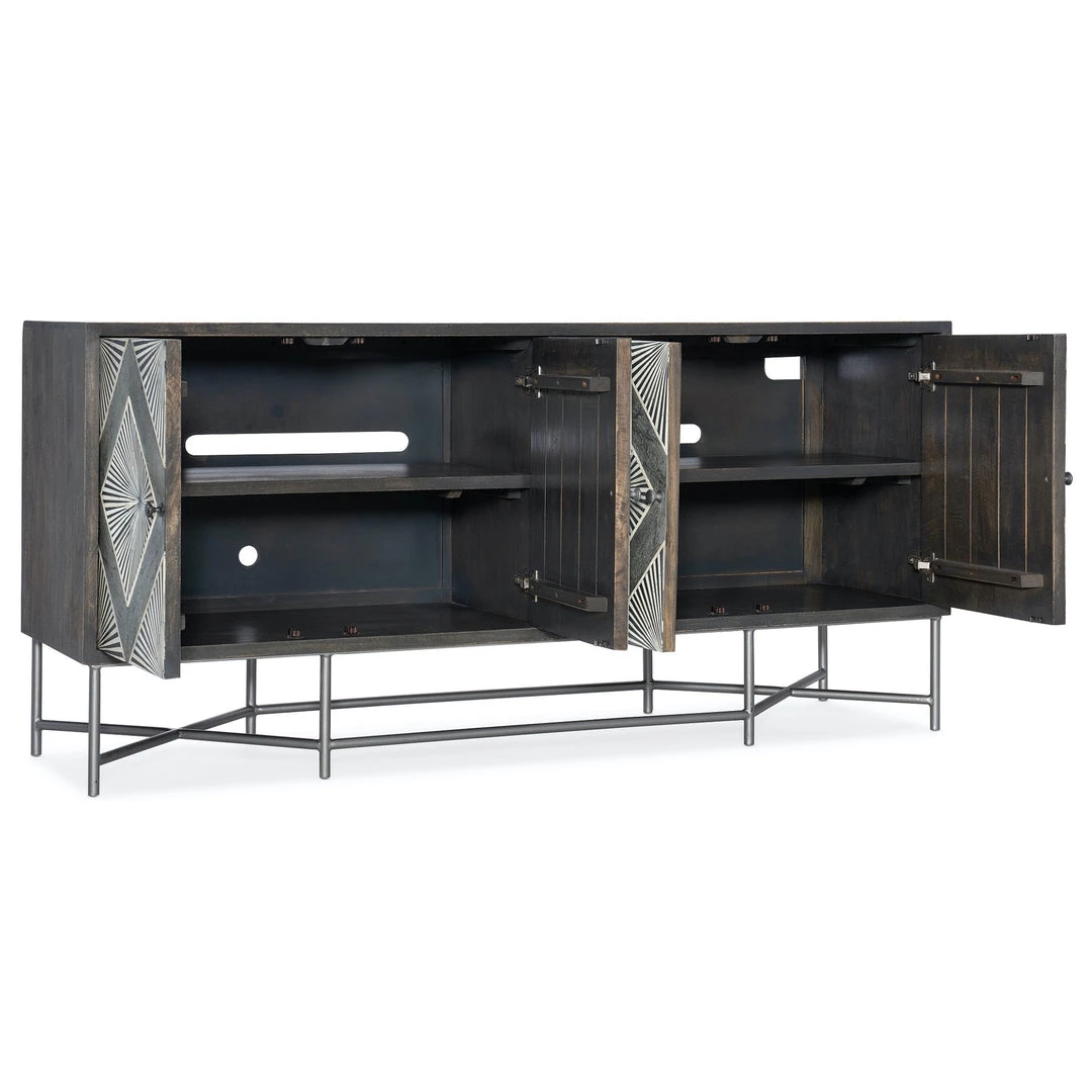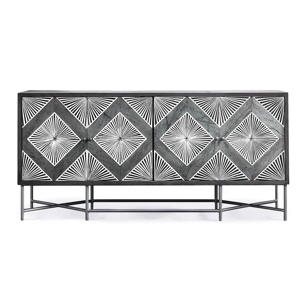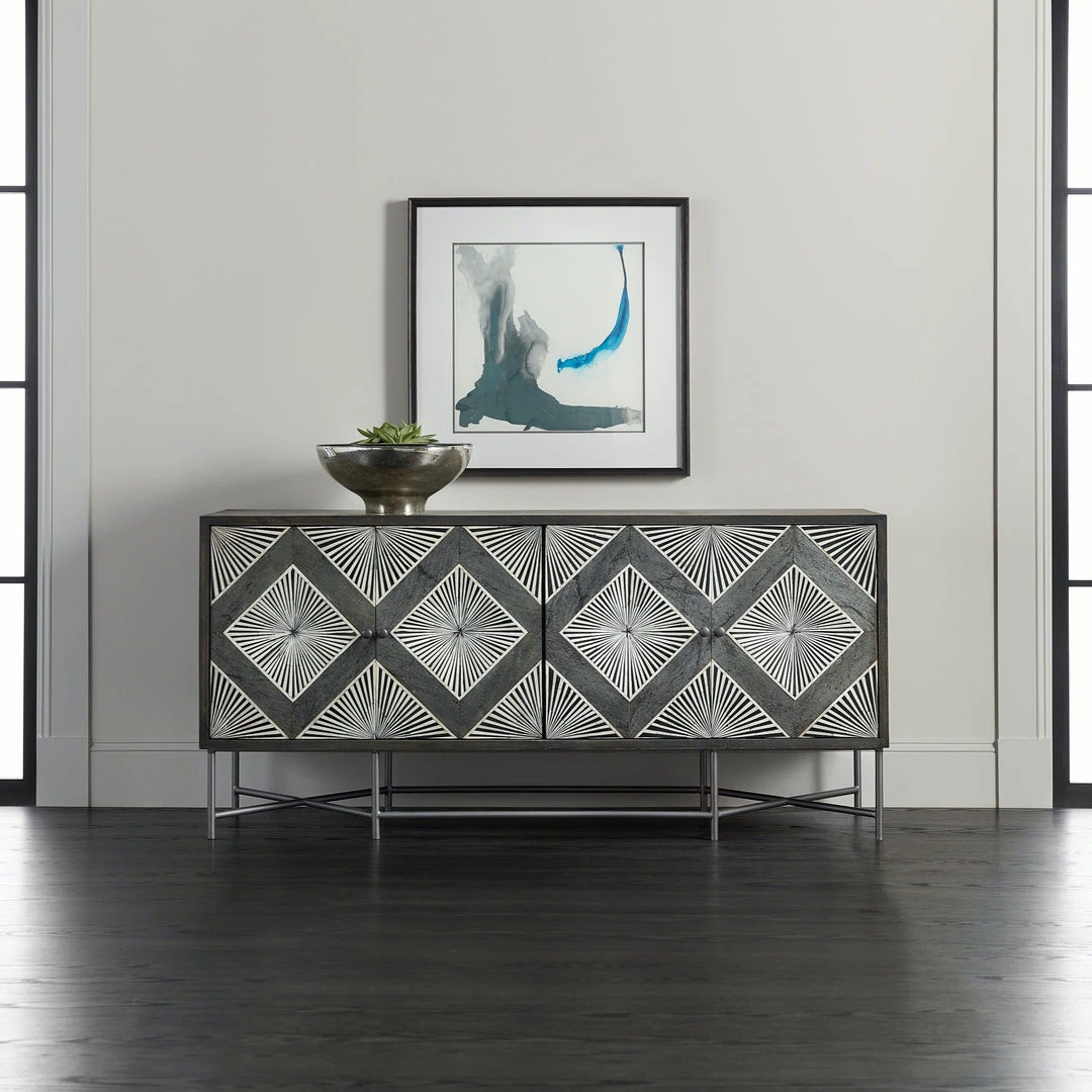 The media-ready Malin Console uses a mix of materials blending inspiration from geometric textiles with a global aesthetic to create a design that is a work of art. Featuring a grey-finished mango wood case, Malin’s four doors are adorned with slate veneer and bursts of contrasting bone inlay that create a striking diamond pattern to add a graphic focal point to a space.