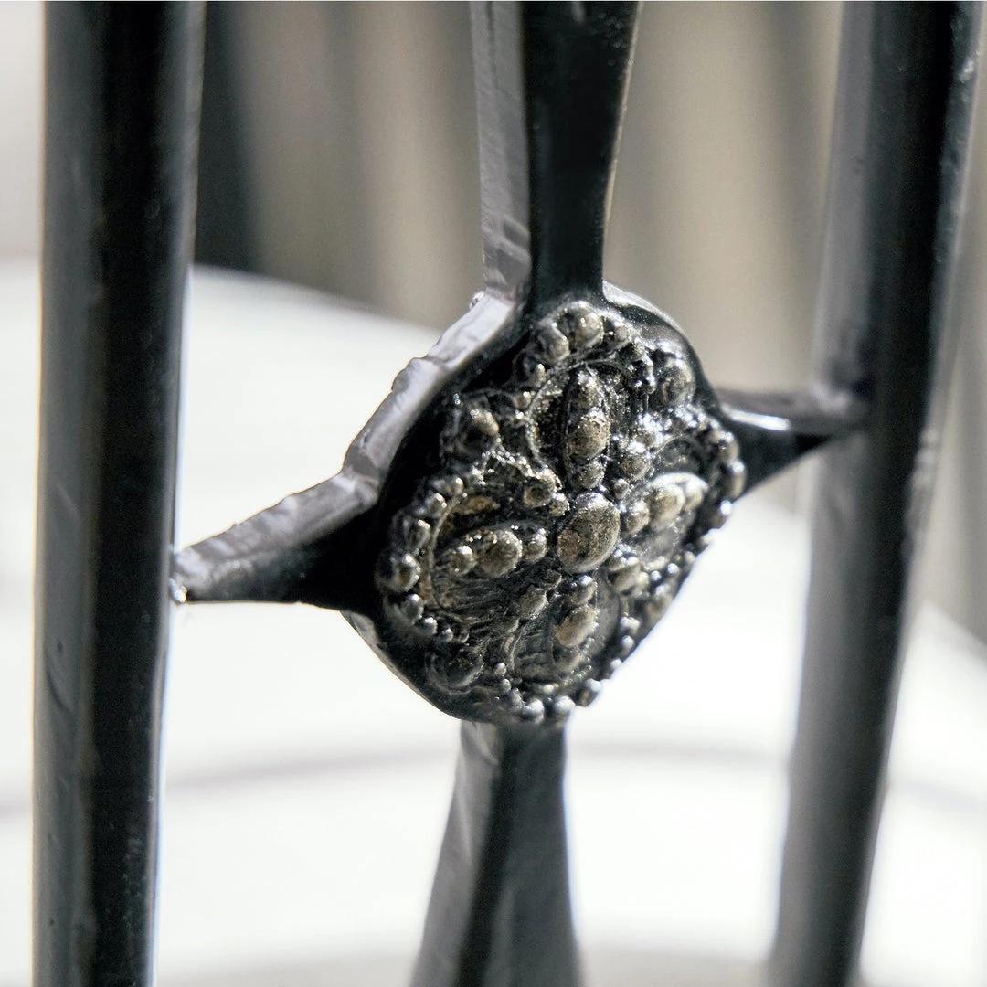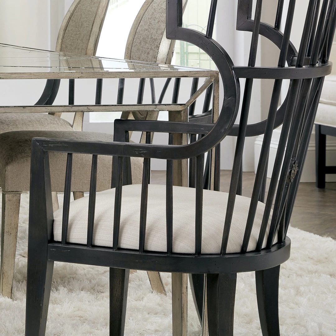 Vintage yet modern, classic yet chic, the Noir Couture Host chair is not your mama’s rake-back chair. Striking a profile that will turn heads and invite you to sit for a while, the host chair contrasts the dramatic Noir black painted finish with a performance fabric seat in Metal Icicle, a dreamy white with silver undertones.