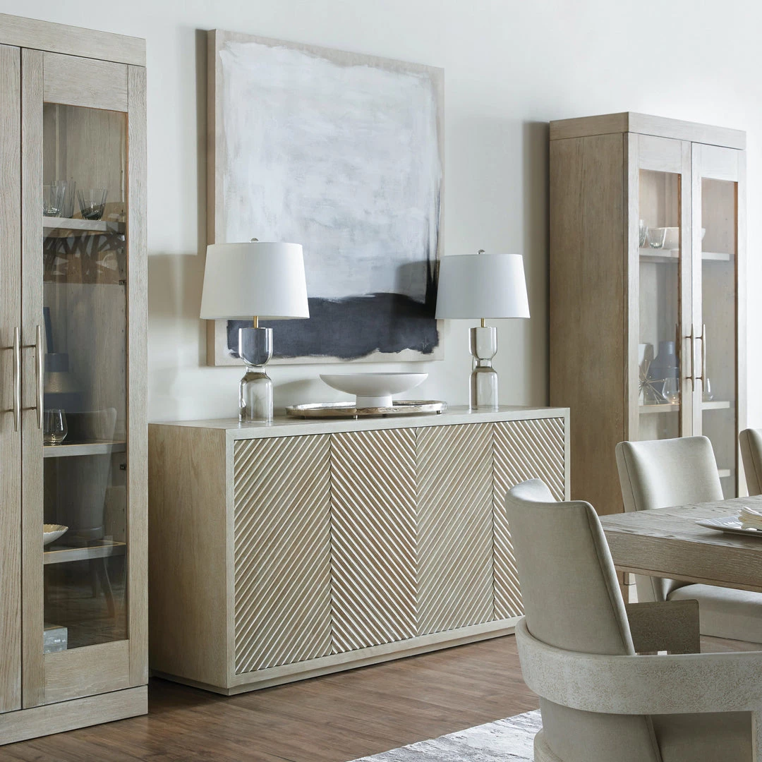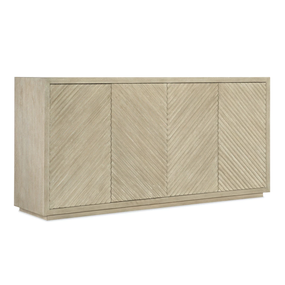 The Palisades Credenza invokes modern Zen with its streamlined design in a light and airy neutral color palette. Reeded door fronts add texture and create a subtle geometric pattern that centers the design of this four drawer cabinet.