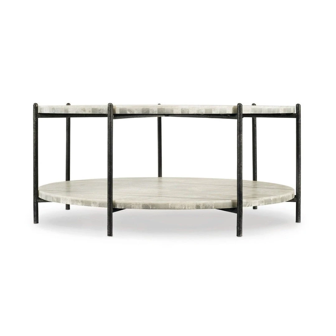 Industrial meets couture chic. Combining an alluring round White Onyx top and bottom shelf with patterned veining set in a slender iron frame, the Pavia Cocktail Table creates a versatile focal point that will add function and fashion to your living space.