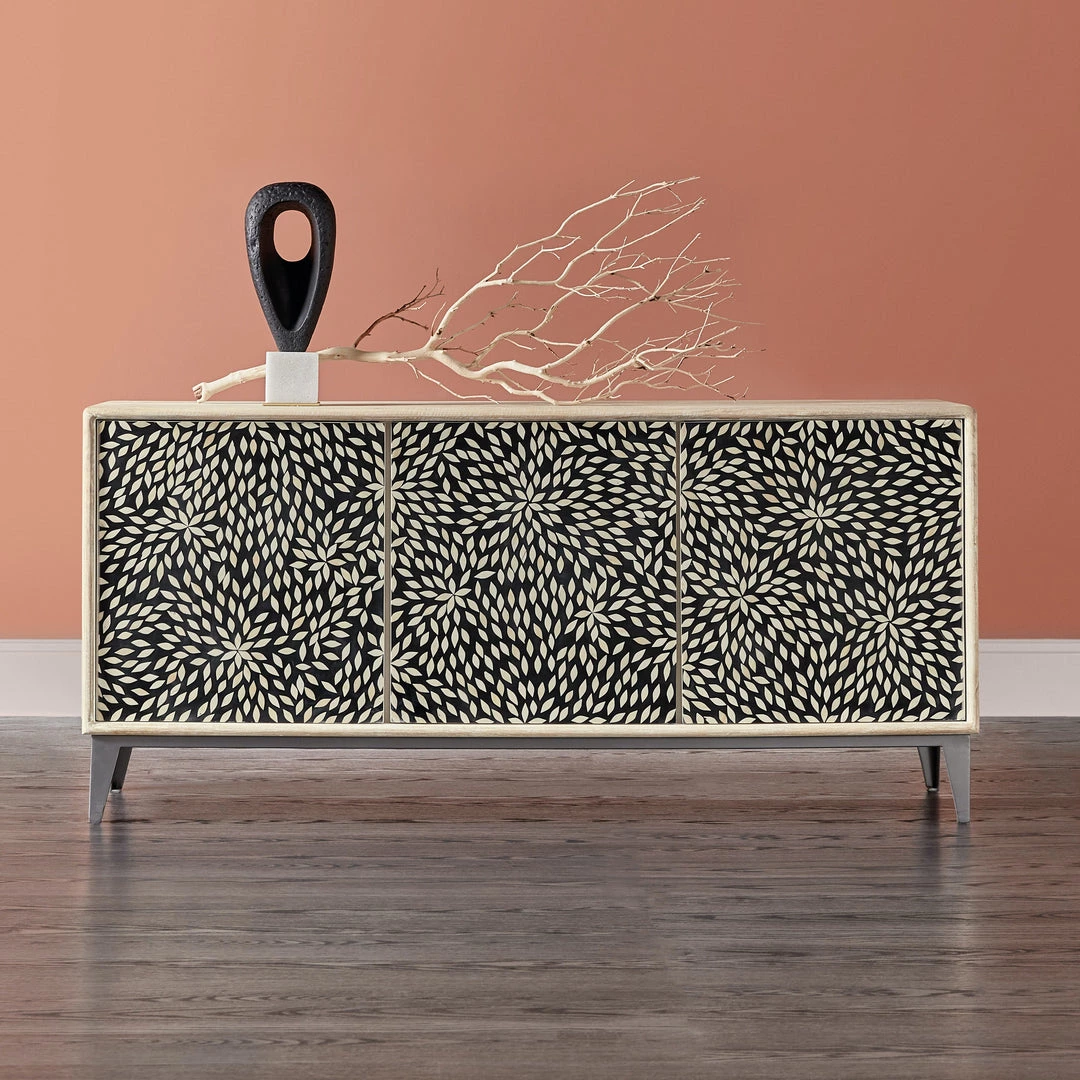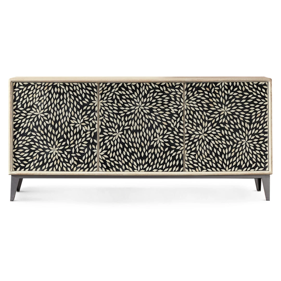 Light natural casing surrounds three door fronts with a graphic black and white bone inlay mosaic to create a majorly artistic statement piece. Spacious interior shelving brings ample storage to the dining or living room, with rear cutouts for cord management.