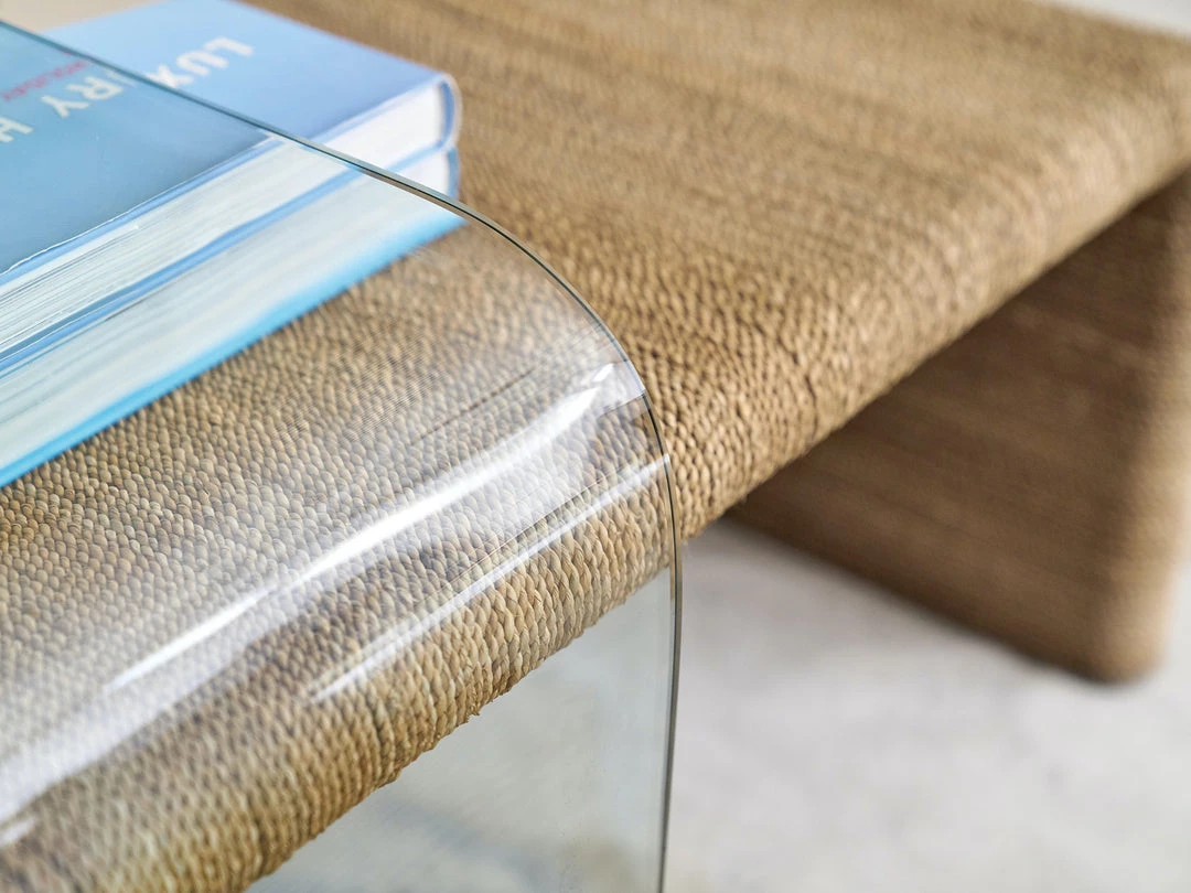 Casual yet modern, this over-sized coffee table has beach house style with a natural jute rope wrapped base table layered with a curved 1/2″ slab of clear tempered glass.Â