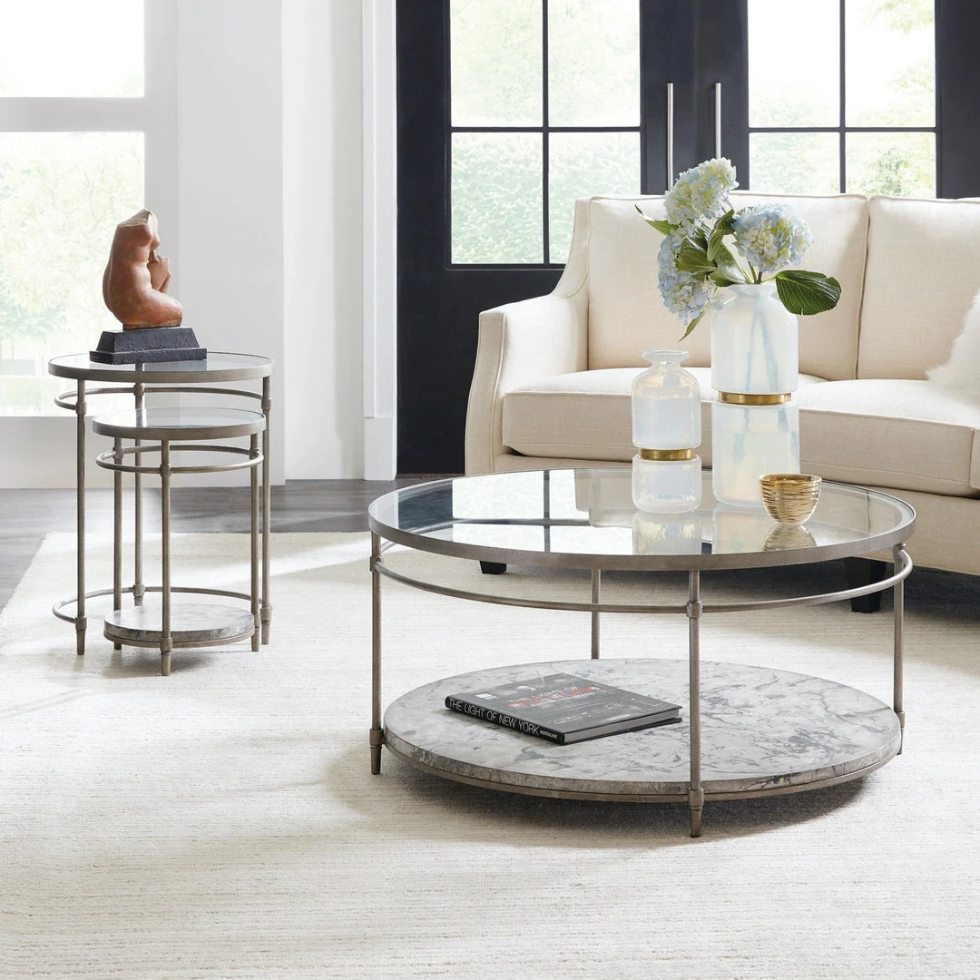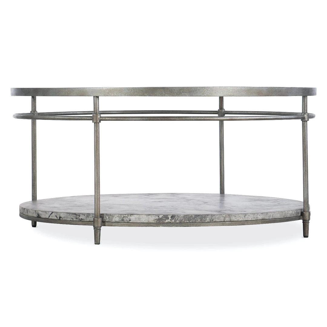 Beautifully scaled and intricately designed, this stunning round cocktail table pairs a champagne-colored metal frame with a glass top and concrete bottom with a soft gray and black pattern. Give your home a shot of style with our living room furniture. Make this room the perfect spot for conversation, entertaining or just relaxing.