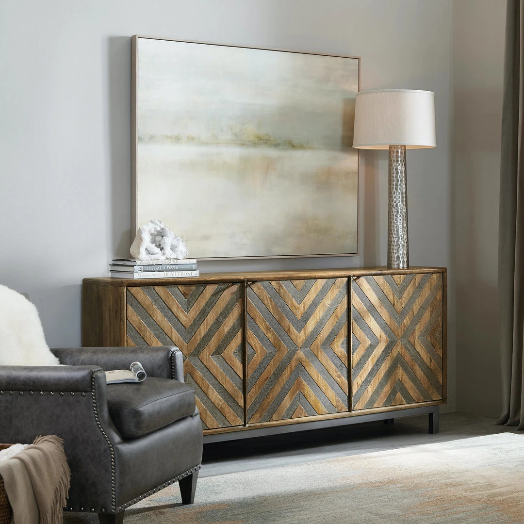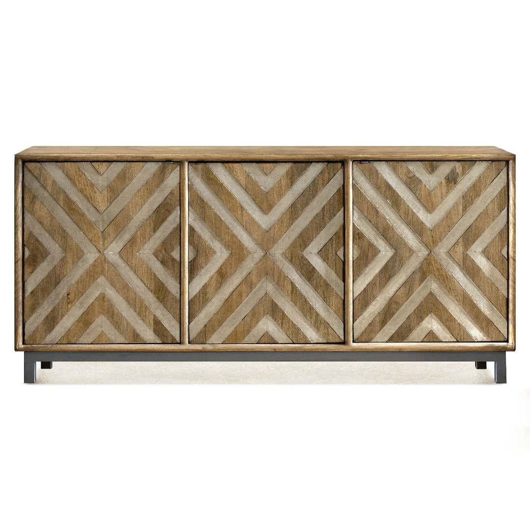 With a chic designer look for sophisticated casual appeal, the Serramonte Console is crafted of Mango Wood and features a German silver metal chevron-patterned inlay on the front with dark pewter-colored European pulls. Use as dining or media storage, this console has 3 doors and 3 removable shelves with a ventilated back panel.