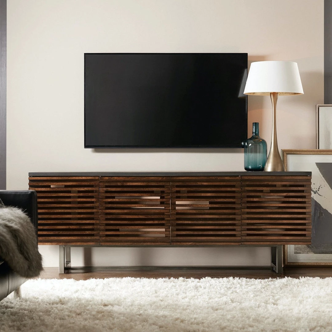 This linear-driven design features four louvred wood doors to accommodate media components without disrupting functionality. Crafted from Elm in a warm wood finish, the contrasting grey top and brushed steel base a extra intrigue to this modern take on mid-century style.