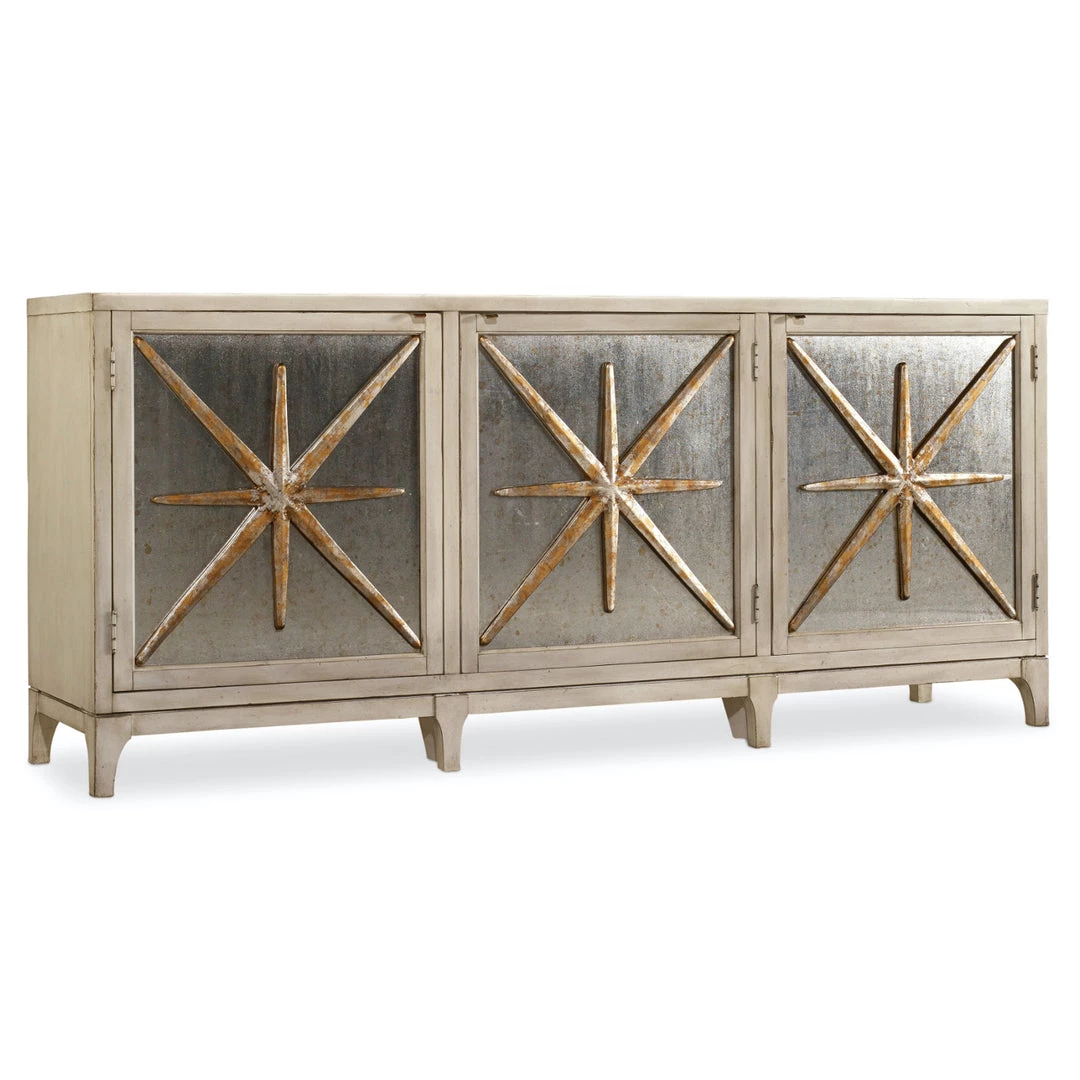 Your eye is immediately drawn to the star design that shimmers in soft radiance with the eglomise mirrored door fronts of this elegant antique white finished credenza. The Starry Console is not only fashionable but functional. Three doors with two adjustable shelves behind each, a three plug outlet, and wire management back panel makes this piece perfect as dining or media storage.