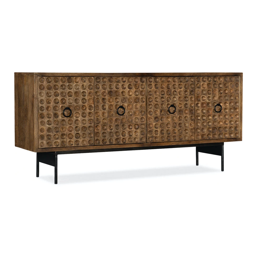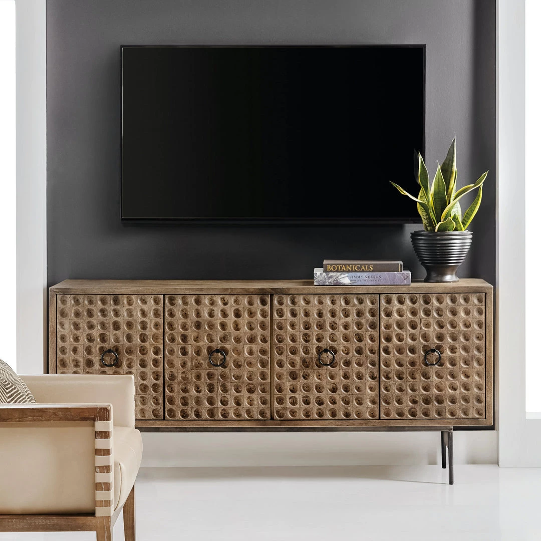 A natural, beautifully storied piece. Crafted from mango wood, the door fronts feature intricate circular carvings for an abstract, global-inspired look. This versatile console can be used in a room with ventilated back panel for media storage and wire management.