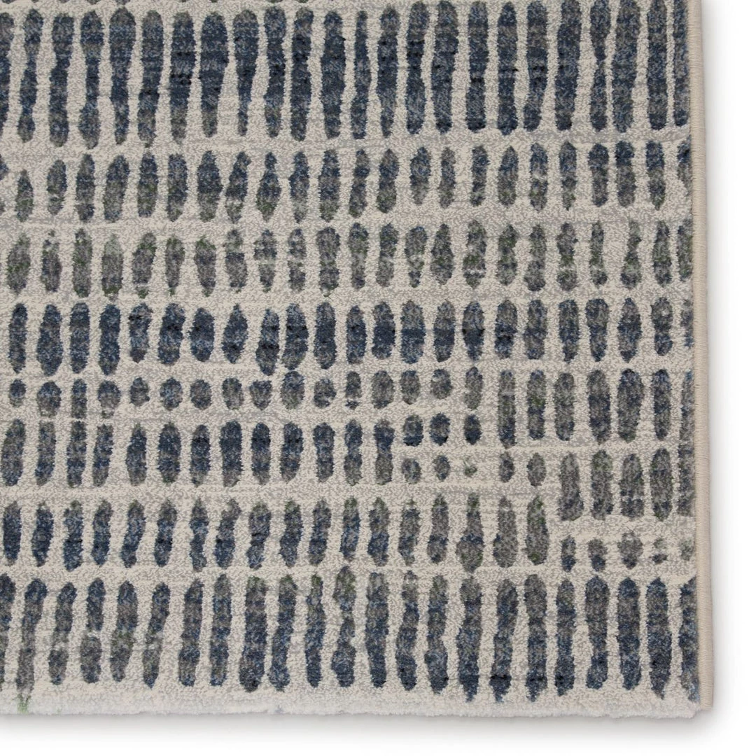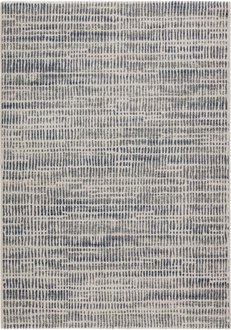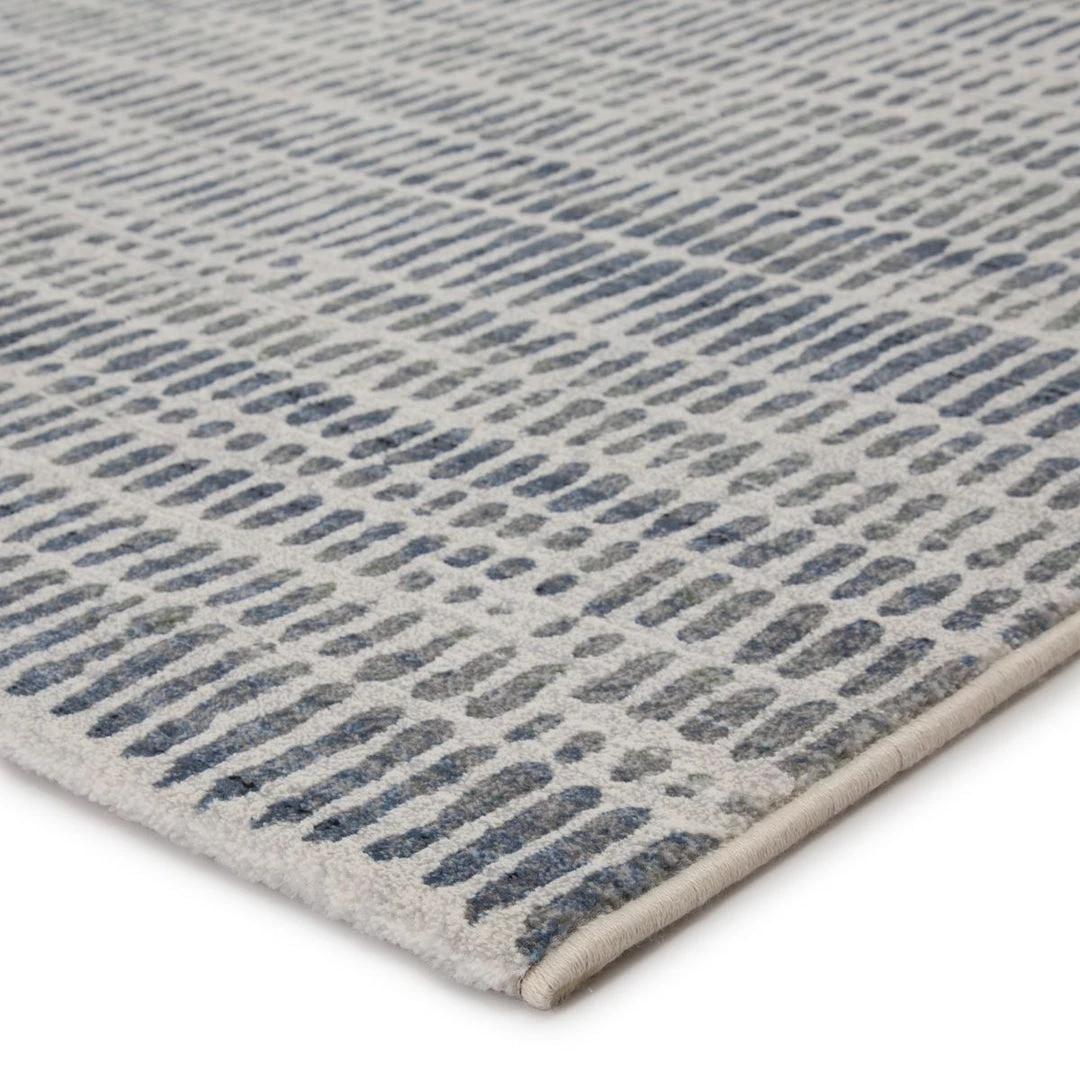 The durable and easy-care Dash collection boasts textural designs and worldly appeal. The pattern-rich Escape rug boasts an abstract, hatch-mark design inspired by the aerial perspective of landscape. In ivory, gray, and blue, this accent offers contemporary, eye-catching style to any space.