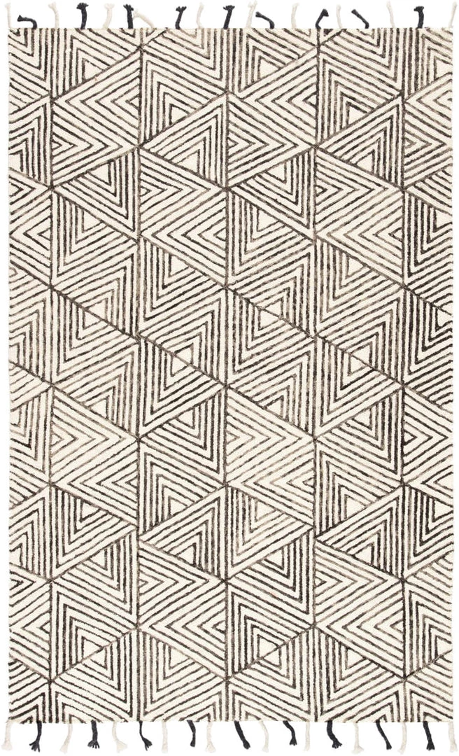 Hand tufted of wool, the Vera collection by Nikki Chu infuses contemporary spaces with inspiring patterns and versatile colorways. The captivating Montblanc rug showcases an eye-catching geometric pattern in a black and ivory colorway. The linear details, space-dyed effect of the black wool yarn, and the boho-chic tassels lend this rug a stunning handcrafted quality.