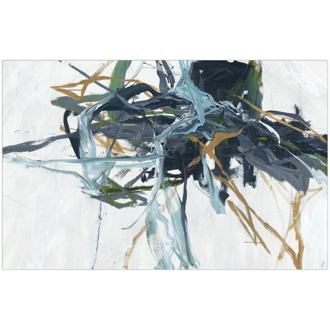“Adjoined Naturally” over-sized blue-green abstract artwork by Kelly O’Neal is printed on canvas with strokes of the original image applied with an artist brush to enhance the authentic feel of the piece. This gallery-wrapped giclee is hand stretched over 1.5″ stretcher bar with your choice of optional frame finishes.