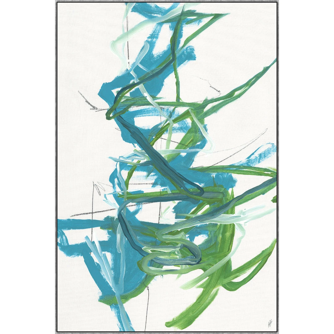 “Affrettando” by Kelly O’Neal abstract artwork in vivid blue-greens is printed on canvas with strokes of the original image applied with an artist brush to enhance the authentic feel of the piece. This gallery-wrapped giclee is hand stretched over 1.5″ stretcher bar with your choice of optional frame finishes.