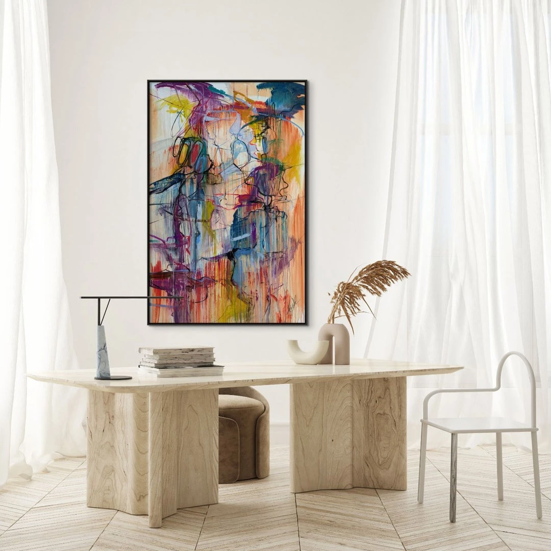 “Another Fine Adventure” abstract artwork by Kelly O’Neal is printed on canvas with strokes of the original image applied with an artist brush to enhance the authentic feel of the piece. This gallery-wrapped giclee is hand stretched over 1.5″ stretcher bar with your choice of optional frame finishes.