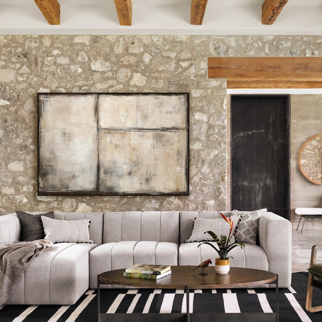 “Blank View” over-sized neutral abstract artwork by Bella Lane is printed on unprimed, exposed canvas with additional brush strokes of actual paint added to the surface to bring depth and texture, and further enhance the authentic feel of the piece. This gallery-wrapped giclee is hand stretched over 1.5″ stretcher bar with your choice of optional frame finishes.