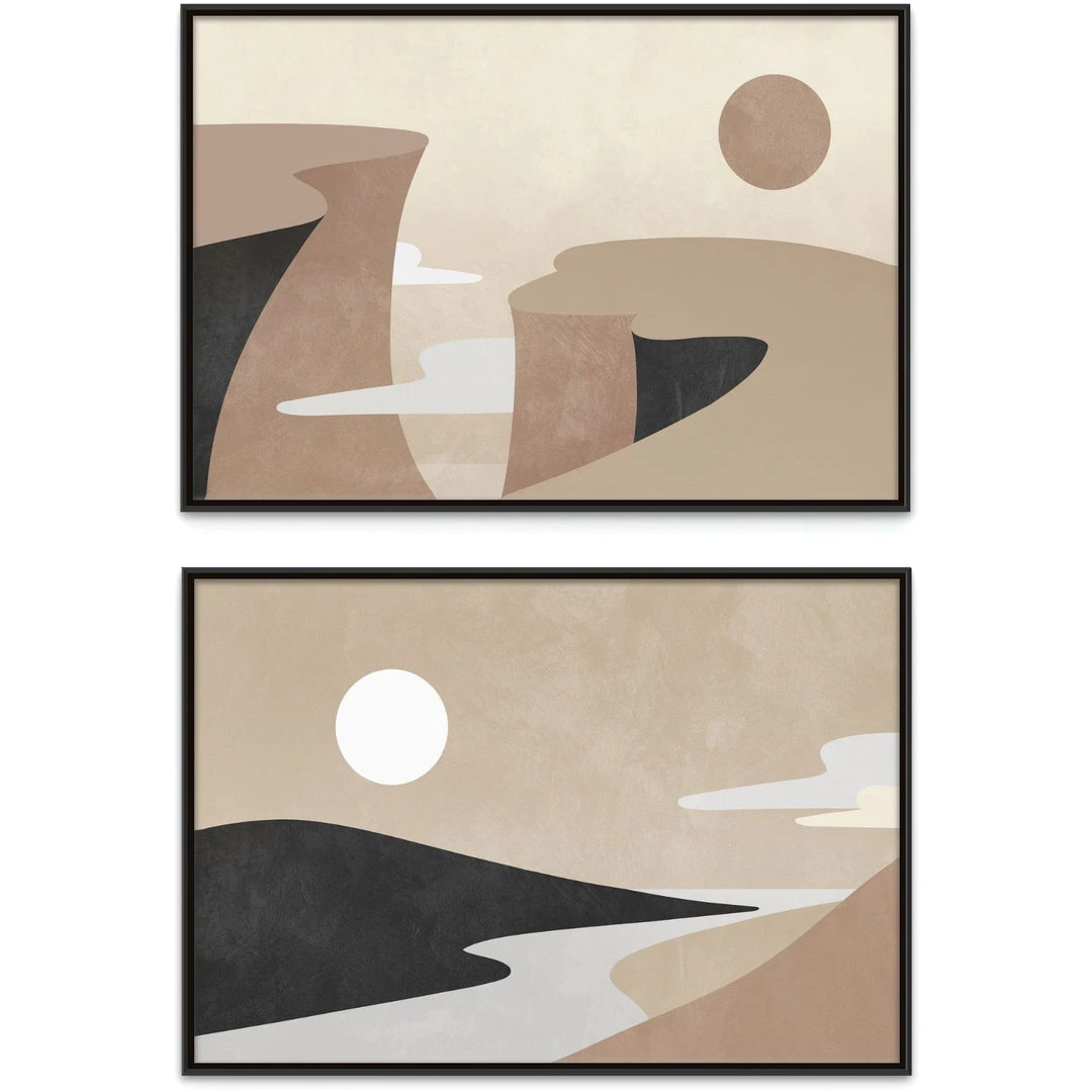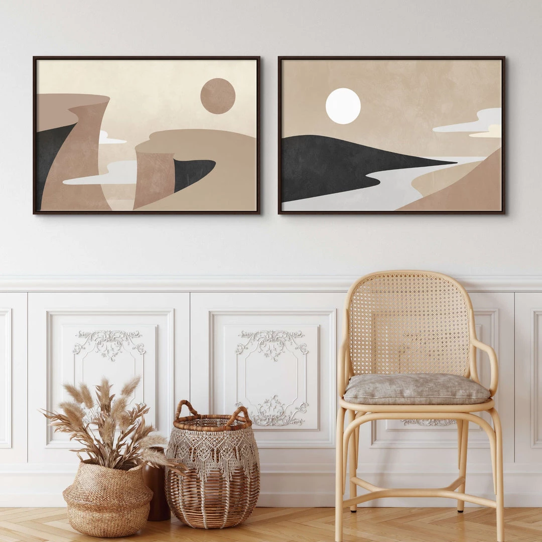 “Day and Night” abstract minimalist landscape diptych artwork by David Brown is printed on canvas with strokes of the original image applied with an artist brush to enhance the authentic feel each piece. This gallery-wrapped giclee is hand stretched over 1.5″ stretcher bar with your choice of optional frame finishes.