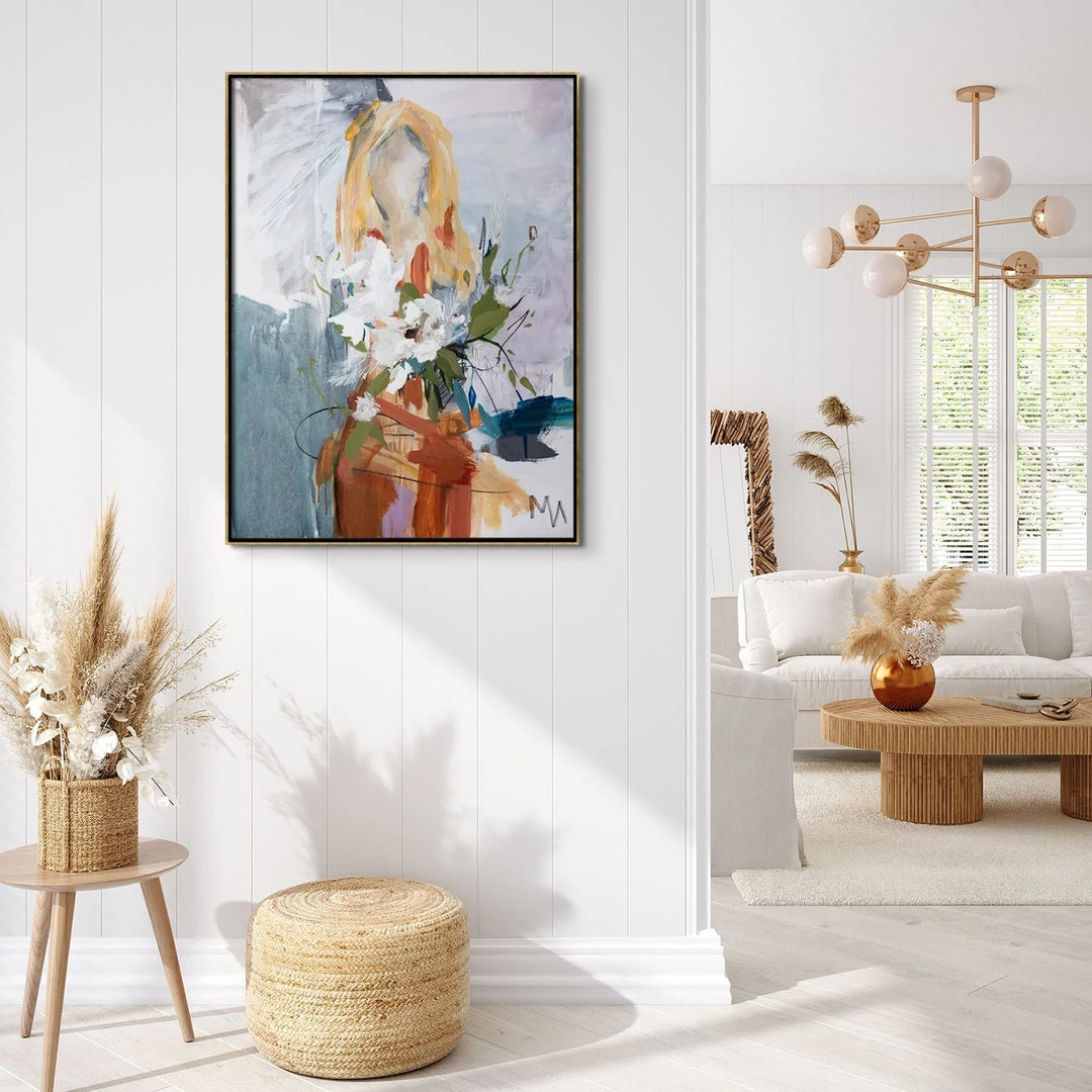 “Feathers and Frost” abstract figurative artwork by Mia Malcom is printed on canvas with strokes of the original image applied with an artist brush to enhance the authentic feel of the piece. This gallery-wrapped giclee is hand stretched over 1.5″ stretcher bar with your choice of optional frame finishes.