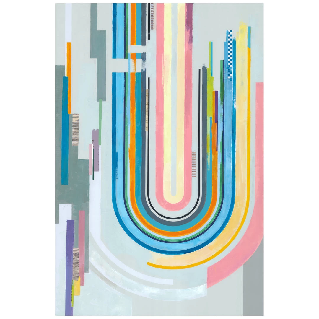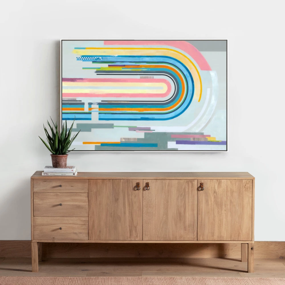 “Gap I” retro inspired geometric artwork by Sonia Noir is printed on canvas with strokes of the original image applied with an artist brush to enhance the authentic feel of the piece. This gallery-wrapped giclee is hand stretched over 1.5″ stretcher bar with your choice of optional frame finishes.