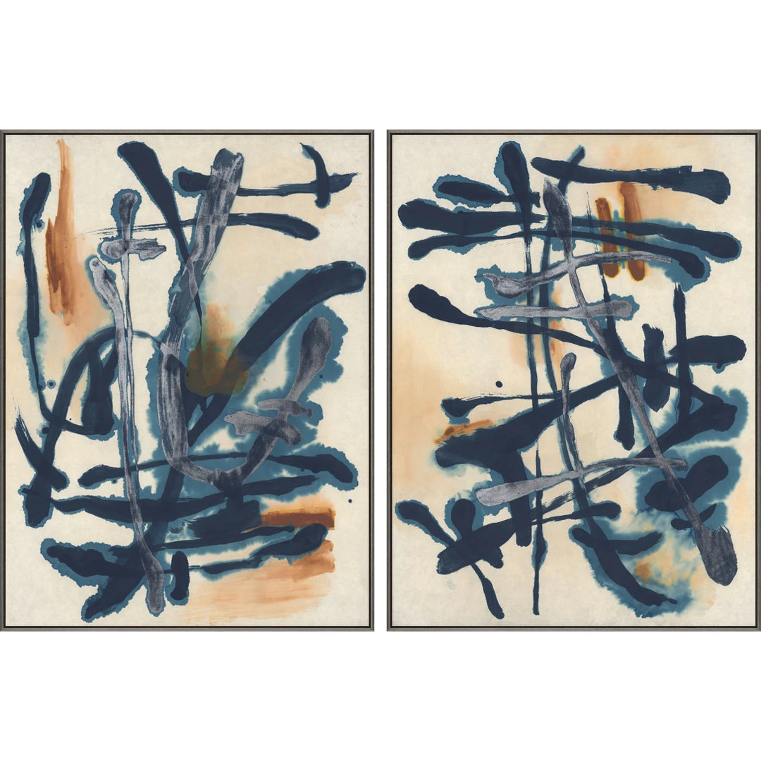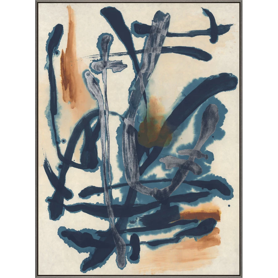 “Mangata” by Jean Kenna features metallic gold silver leaf that embellishes sections of the artwork. This blue abstract giclee is available glass framed or gallery-wrapped on canvas that is hand stretched over 1.5″ stretcher bar with your choice of optional frame finishes.
