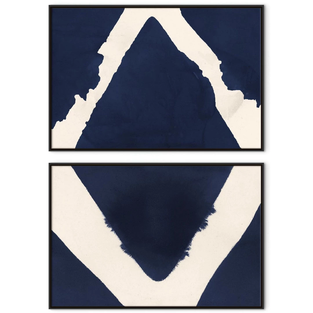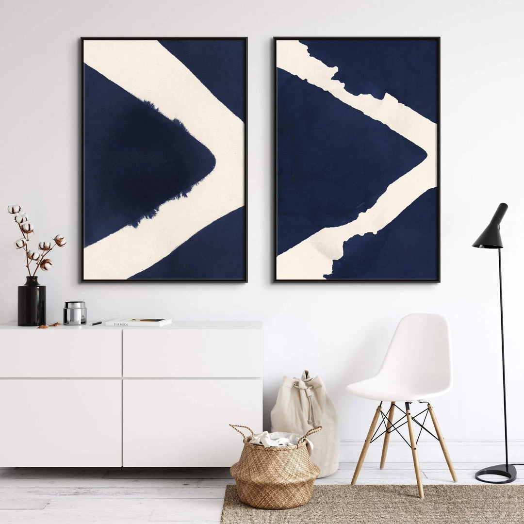 “Navy Arrow” diptych artwork by Dawn Sweitzer features minimalist abstract angles in navy blue and cream. Available in two designs, this gallery-wrapped giclee is printed on canvas in a matte finish and hand stretched over 1.5″ stretcher bar with 180 degree dual hangers installed and your choice of optional frame finishes.