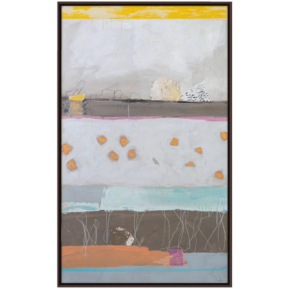 “Pacific” abstract landscape artwork by Adele Kaars Sypesteyn is printed on canvas with a waxy gel finish applied vertically to the image to for glossy texture. This gallery-wrapped giclee is hand stretched over 1.5″ stretcher bar with your choice of optional frame finishes. This gallery-wrapped giclee is hand stretched over 1.5″ stretcher bar with your choice of optional frame finishes.