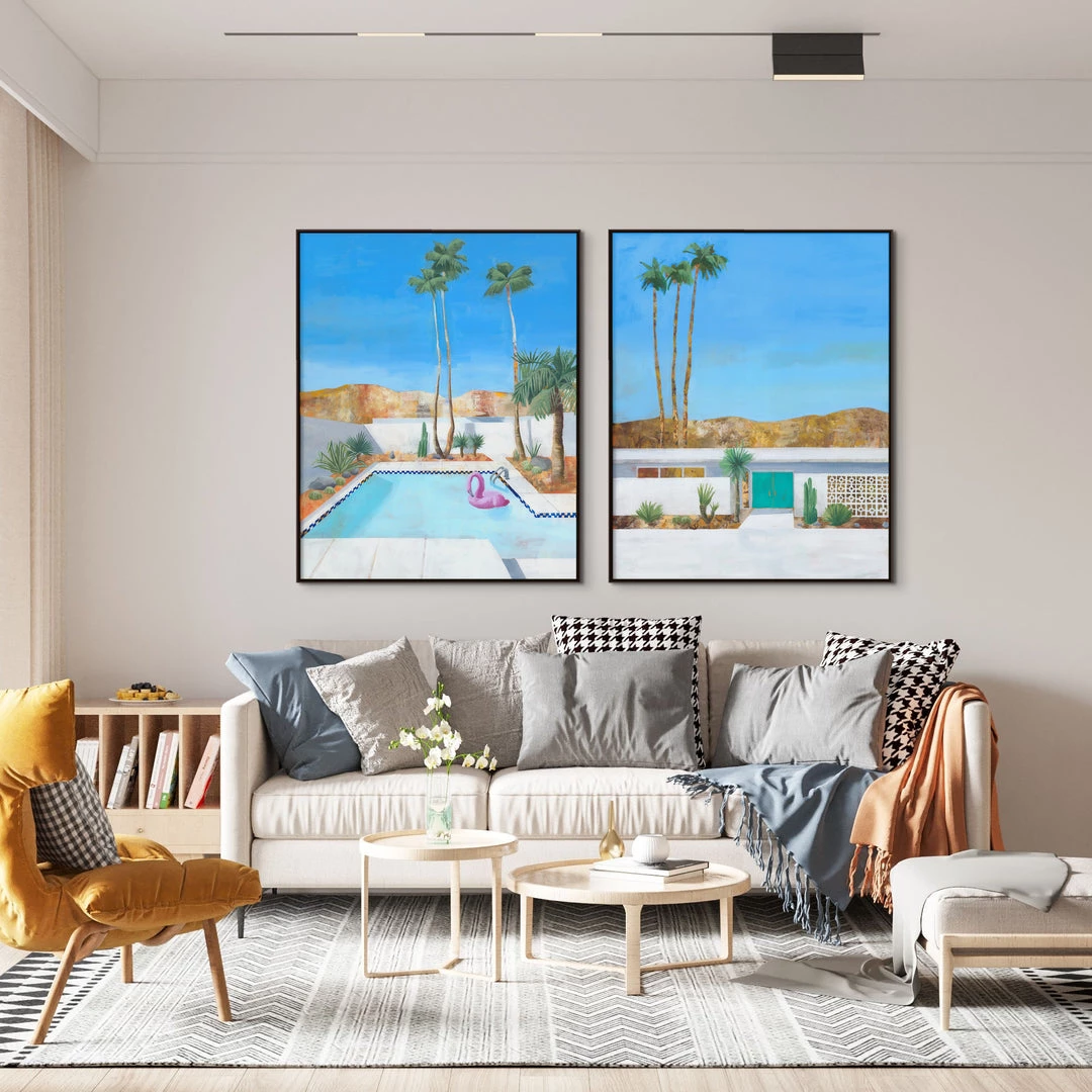 “Palm Springs” retro 1950’s desert oasis house artwork by Fern Cassidy is printed on canvas with strokes of the original image applied with an artist brush to enhance the authentic feel of the piece. This gallery-wrapped giclee is hand stretched over 1.5″ stretcher bar with your choice of optional frame finishes.
