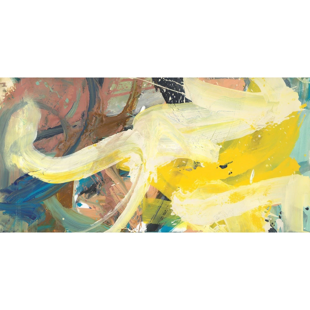 “Reflecting Sunlight” over-sized abstract tryptic series artwork in bright yellow multi hues by Ryan Brown is printed on canvas with strokes of the original image applied with an artist brush to enhance the authentic feel of the piece. This gallery-wrapped giclee is hand stretched over 1.5″ stretcher bar with your choice of optional frame finishes.