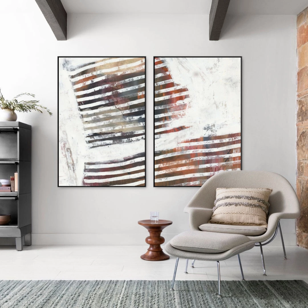 A creative canvas art print by Bella Lane, “Simultaneous” bleeds abstract lies of white of red orange multi hues that is hand embellished with a textured finish for a realistic painted look.