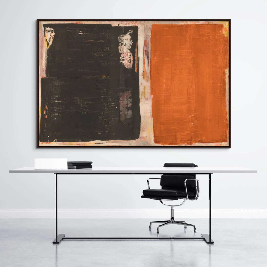 “Tarinished” minimalist abstract artwork by David Erickson is printed on unprimed, exposed canvas giving an organic feel to the piece. This gallery-wrapped giclee is hand stretched over 1.5″ stretcher bar with your choice of optional frame finishes.