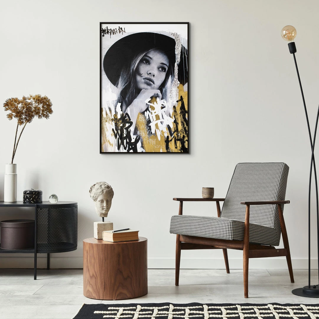 “The Girl with All The Words” metallic gold embellished black and white portrait artwork by Addison Jones is printed on canvas with strokes of the original image applied with an artist brush to enhance the authentic feel of the piece. This gallery-wrapped giclee is hand stretched over 1.5″ stretcher bar with your choice of optional frame finishes.