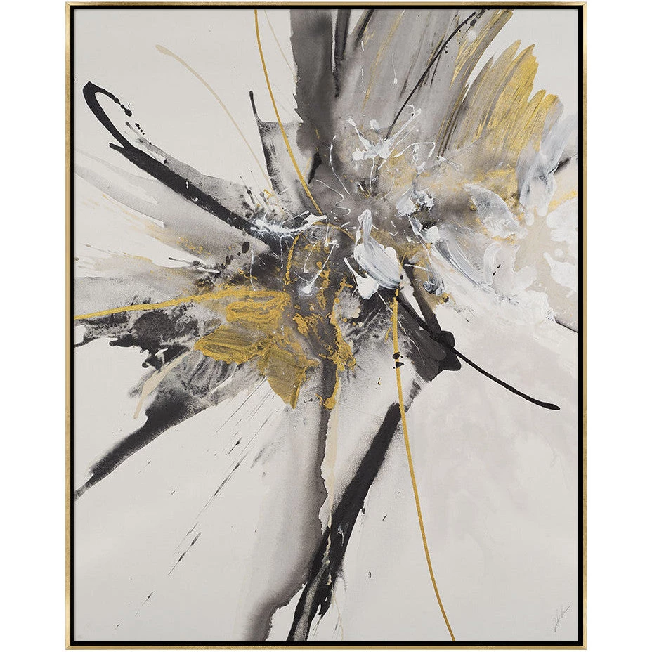“The Space Between” abstract artwork by Tom Potocki is printed on canvas and hand embellished with acrylic paint and metallic gold to add texture and interest. This gallery-wrapped giclee is hand stretched over 1.5″ stretcher bar with your choice of optional frame finishes.
