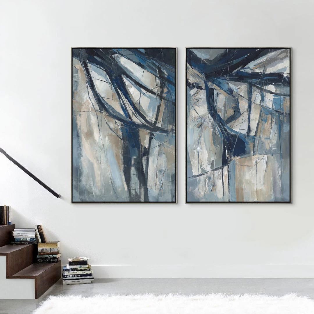 “The Verve” abstract diptych artwork in blue grey hues by Jacob Lincoln is printed on canvas with strokes of texture that follow the image to enhance the authentic feel of the piece. This gallery-wrapped giclee is hand stretched over 1.5″ stretcher bar with your choice of optional frame finishes.