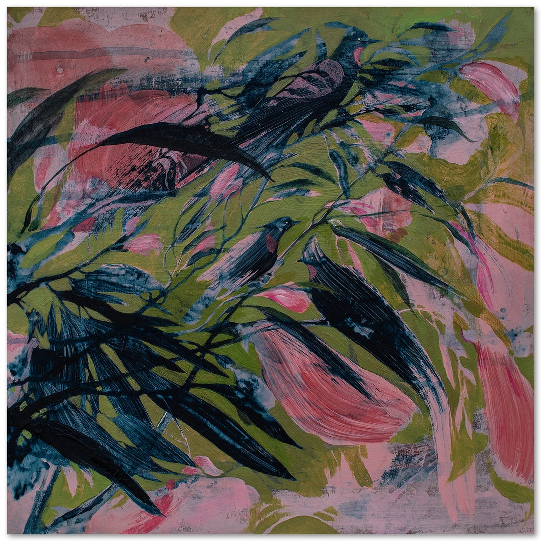 “Three Wise Birds” bohemian floral artwork by Alexander Nikanpour is printed on canvas with strokes of the original image applied with an artist brush to enhance the authentic feel of the piece. This gallery-wrapped giclee is hand stretched over 1.5″ stretcher bar with your choice of optional frame finishes.