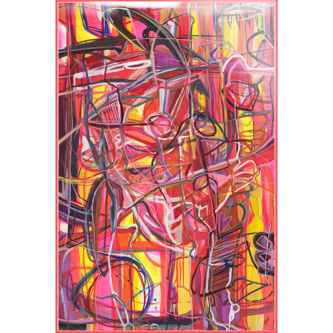 A funky modern abstract piece by Kelly O’Neil is gallery wrapped and stretched over a 1.5″ solid wood framed by a neon pink acrylic plexibox.