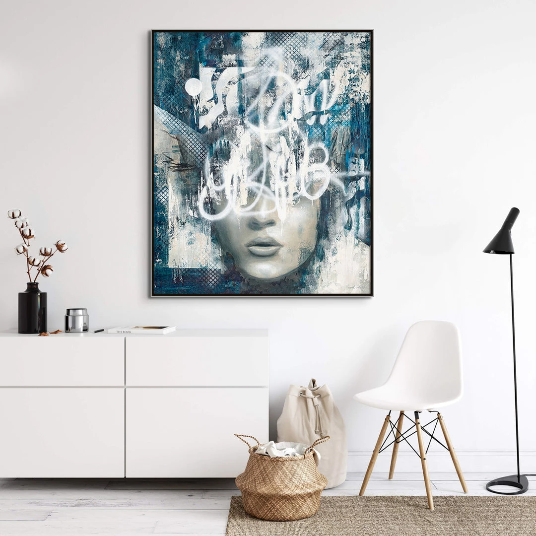 “A Book’s Cover” blue graffiti-inspired abstract portrait artwork by Neil Patrick is printed on canvas with strokes of the original image applied with an artist brush to enhance the authentic feel of the piece. This gallery-wrapped giclee is hand stretched over 1.5″ stretcher bar with your choice of optional frame finishes.