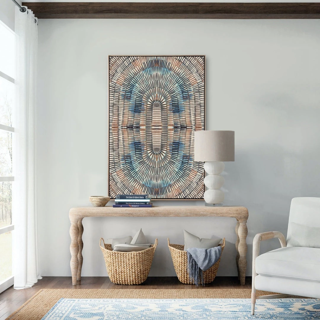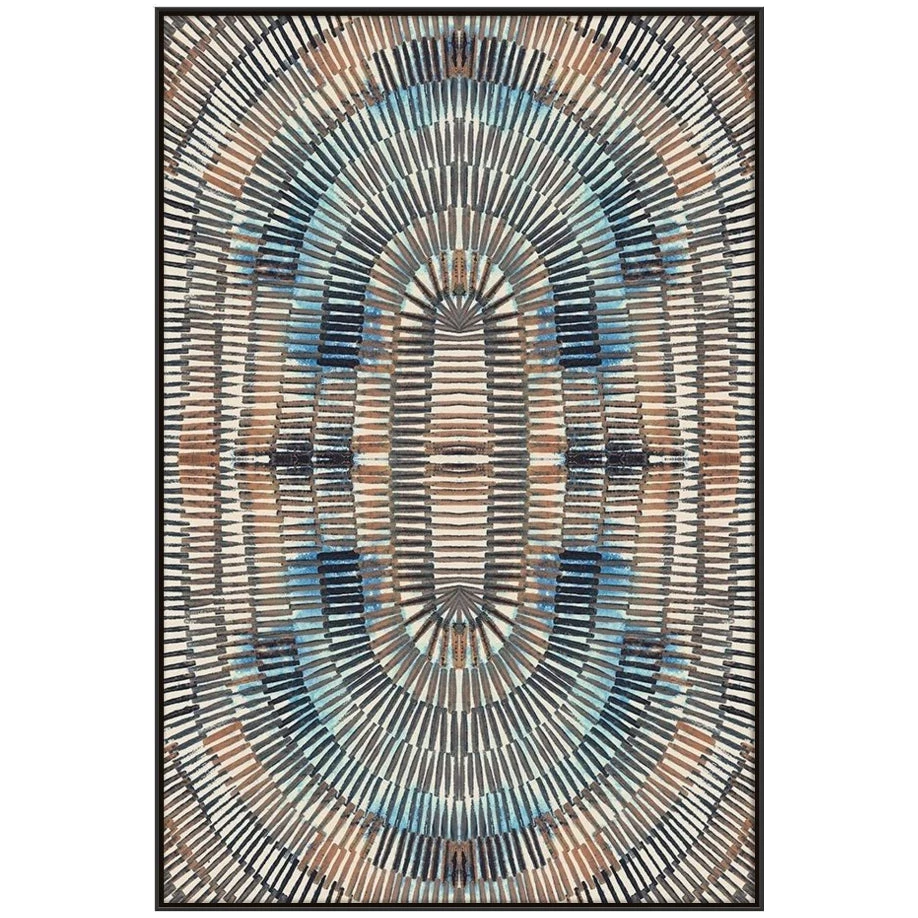 “Blue Supermix” abstract geometric artwork by Danielle Davis is printed on canvas with strokes of the original image applied with an artist brush to enhance the authentic feel of the piece. This gallery-wrapped giclee is hand stretched over 1.5″ stretcher bar with your choice of optional frame finishes.