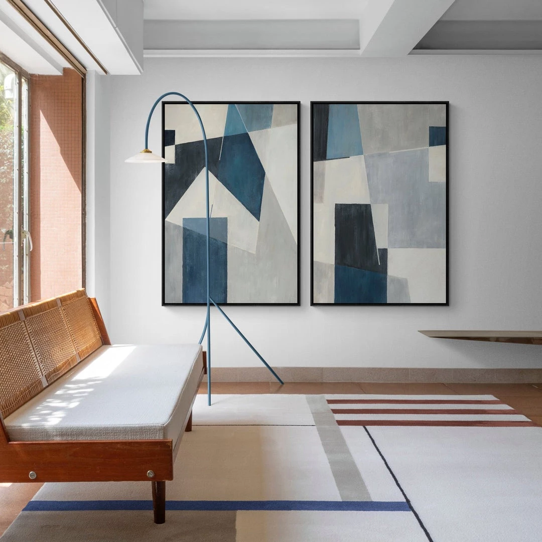 “Congruency” abstract artwork in blue and grey by Richard Ryder is printed on canvas with strokes of texture that follow the image to enhance the authentic feel of the piece. This gallery-wrapped giclee is hand stretched over 1.5″ stretcher bar with your choice of optional frame finishes.