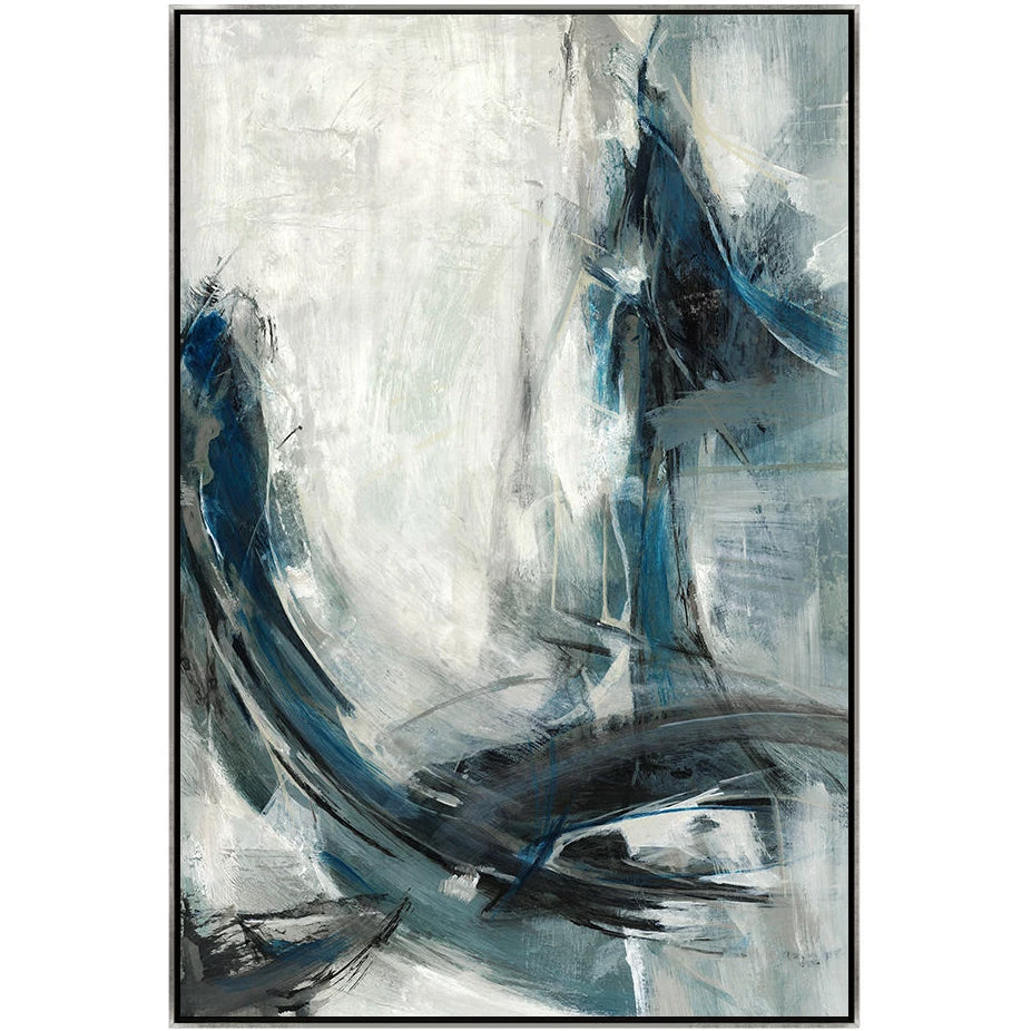 “Out of the Blue” abstract diptych artwork in blue grey hues by Jacob Lincoln is printed on canvas with strokes of texture that follow the image to enhance the authentic feel of the piece. This gallery-wrapped giclee is hand stretched over 1.5″ stretcher bar with your choice of optional frame finishes.