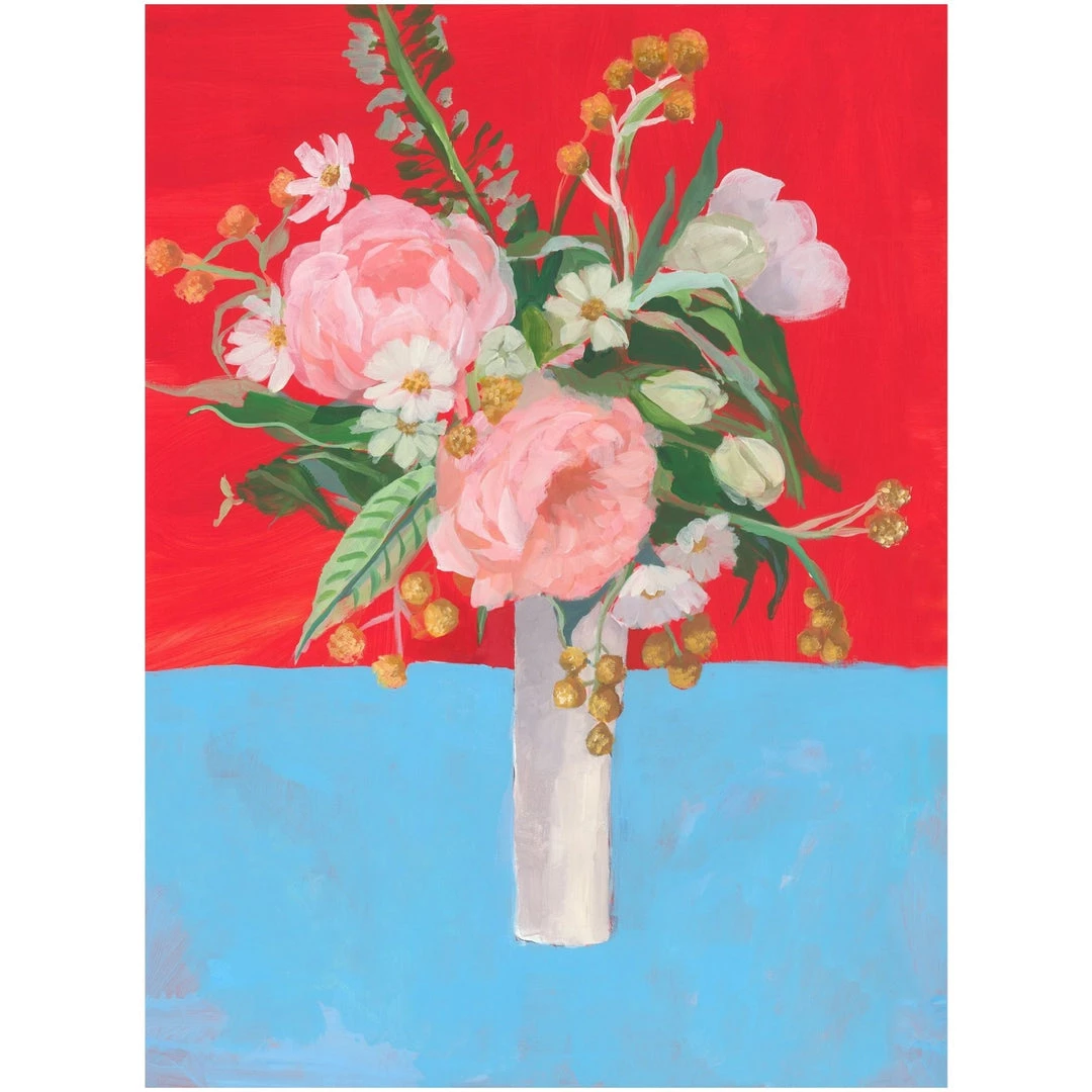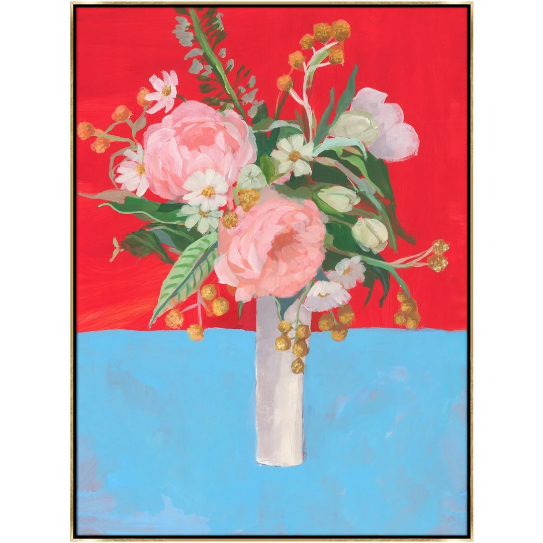 “Peonies on a Summer Day” floral arrangement artwork by Fern Cassidy is printed on canvas with strokes of the original image applied with an artist brush to enhance the authentic feel of the piece. This gallery-wrapped giclee is hand stretched over 1.5″ stretcher bar with your choice of optional frame finishes.