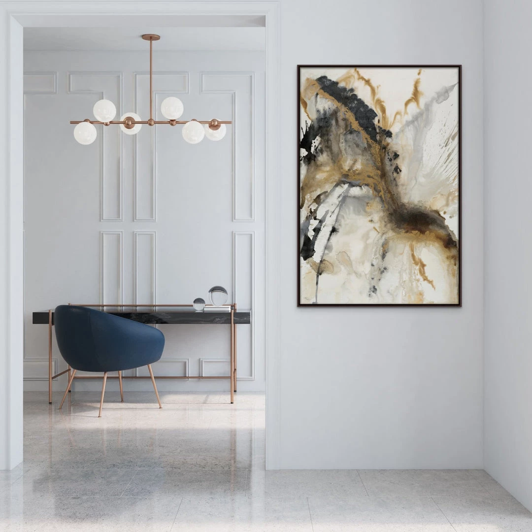 “Personality Traits” abstract artwork by Kelly O’Neal is printed on canvas and hand embellished with metallic gold to bring depth and color, and further enhance the authentic feel of the piece. This gallery-wrapped giclee is hand stretched over 1.5″ stretcher bar with your choice of optional frame finishes.