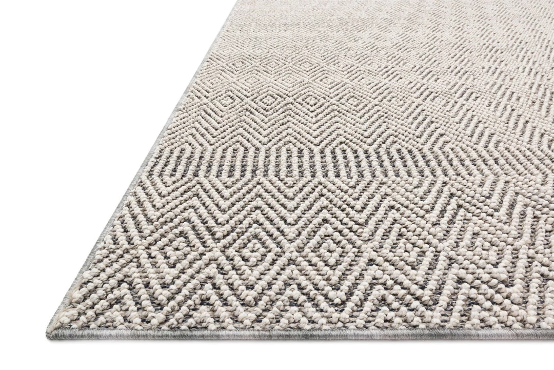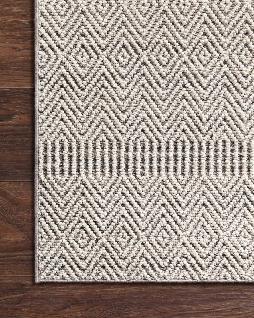This indoor-outdoor rug features a chic woven-diamond pattern neutral tones and contrasting pile height. Soft underfoot, easy to clean and resistant to shedding, this simple area rug is perfect for high-traffic spaces in the home or on the deck or patio.