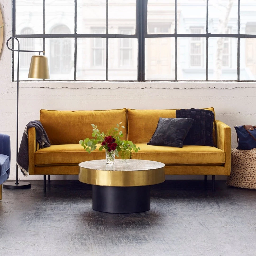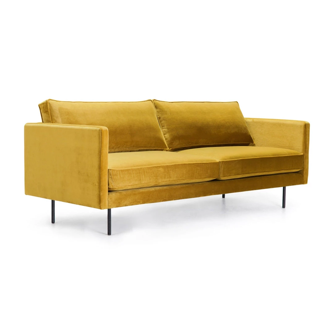 Straight forward mid-century styling adopts regality via gold jewel tone upholstery. Plush velvet forms tailored lines with deep-set cushions while black-finished steel legs stand tall for a clean finishing touch.
