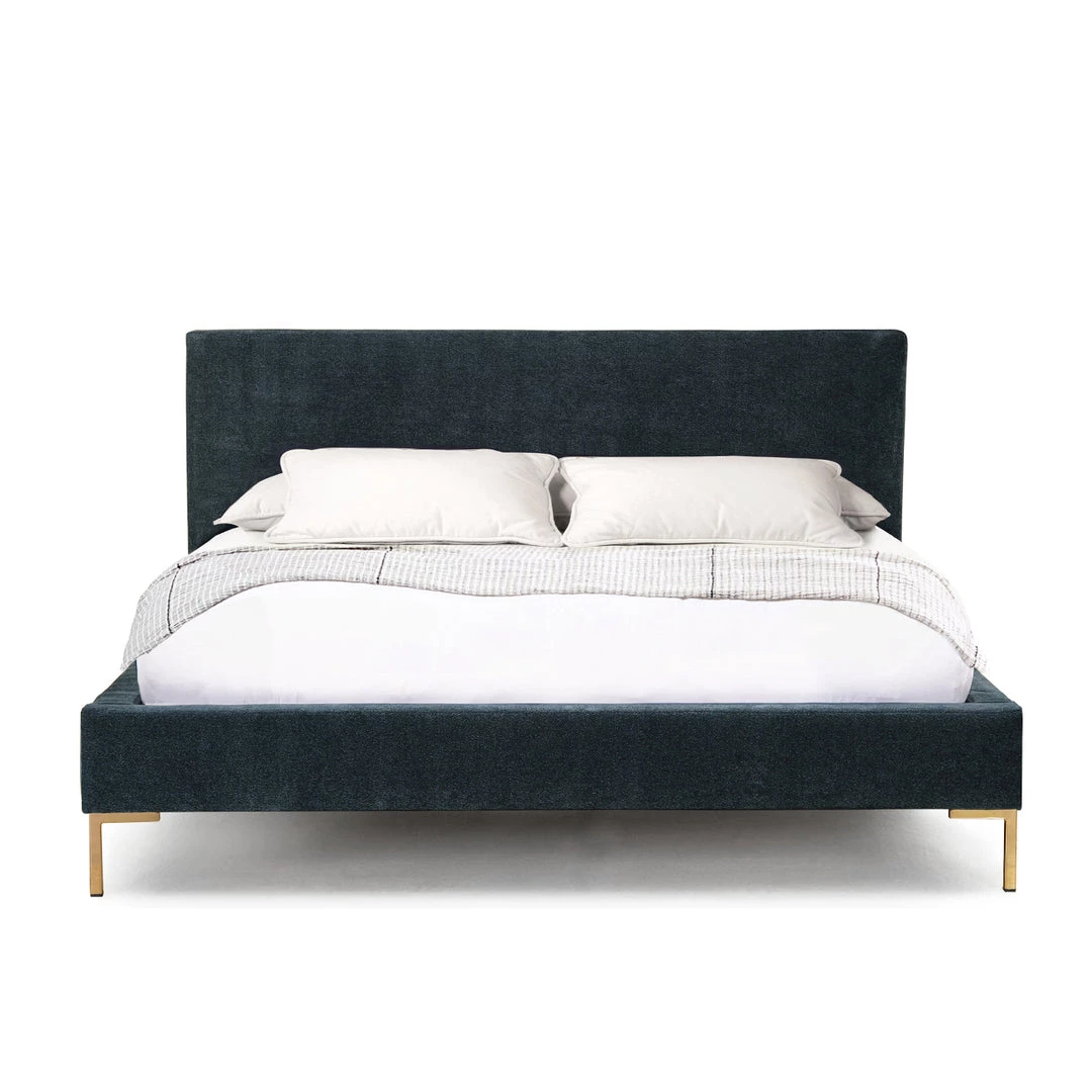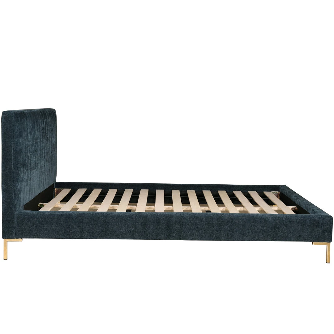 Perfect to breathe new life into your bedroom, Astrid was designed with comfort, luxe, and quality in mind. Fitted with clean lines and a solid pine frame that’s wrapped in a midnight blue velveteen fabric, complete with a padded and upholstered headboard and golden leg accents. This contemporary modern Queen size bed is the sort of simple pleasure you need for a seriously stylish sleep.