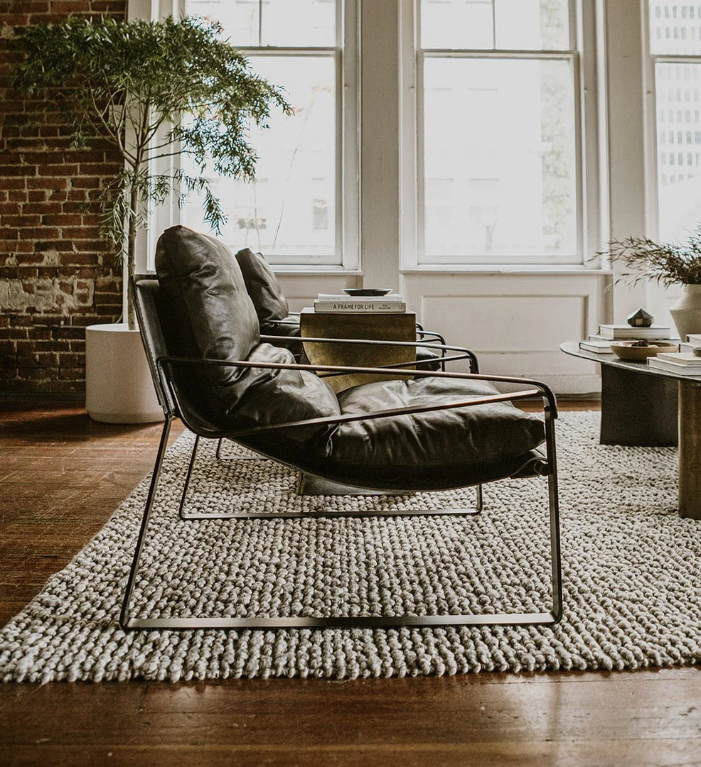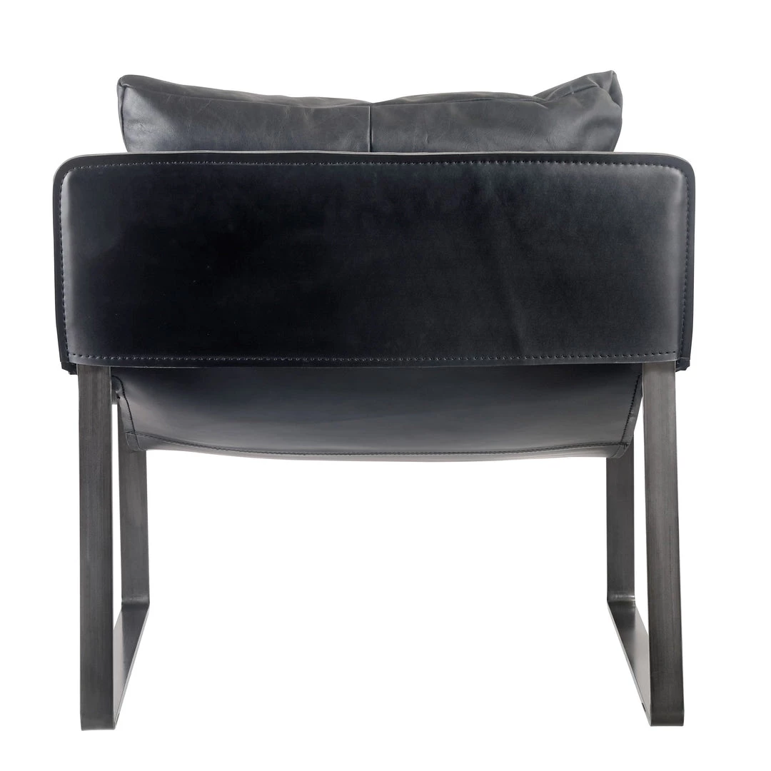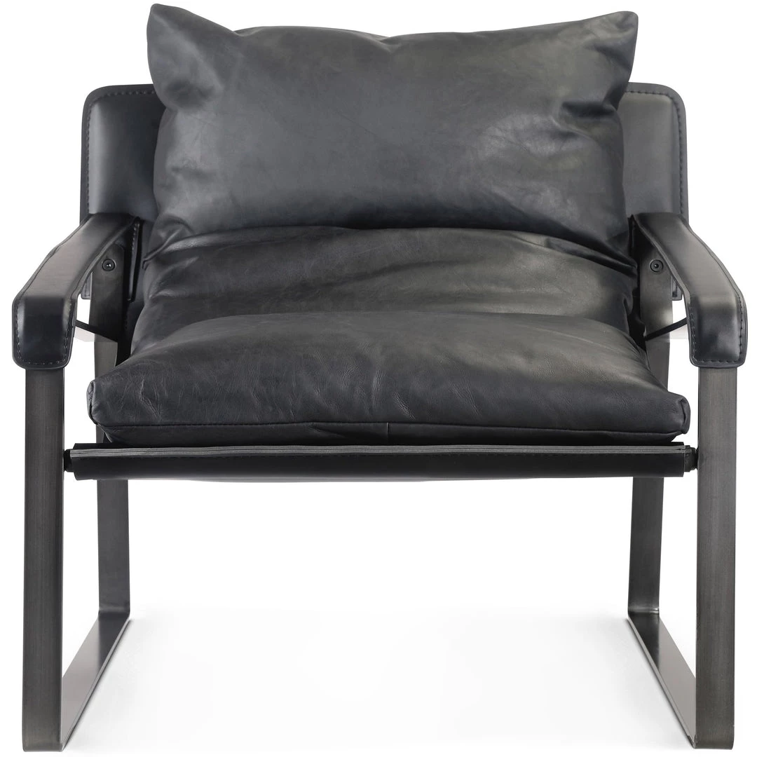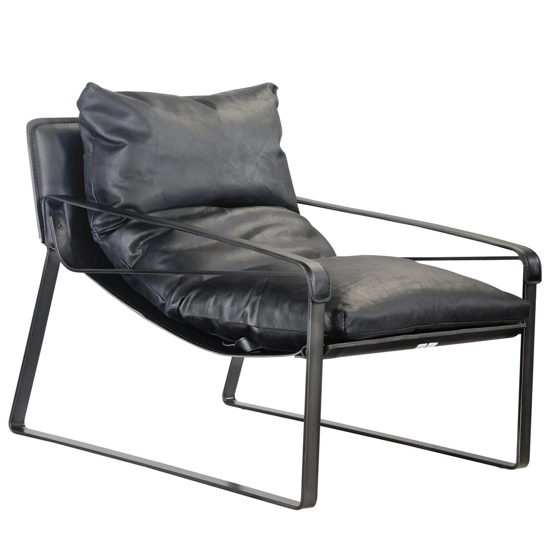 Super stylish, effortlessly cool. The Connor Sling-style seating sits low and curved for a fresh take on a throwback form. With a gunmetal-finished iron frame, soft, top-grain onyx black leather seat and wrapped armrests, the Connor Sling Chair exhibits innately hip industrial design.