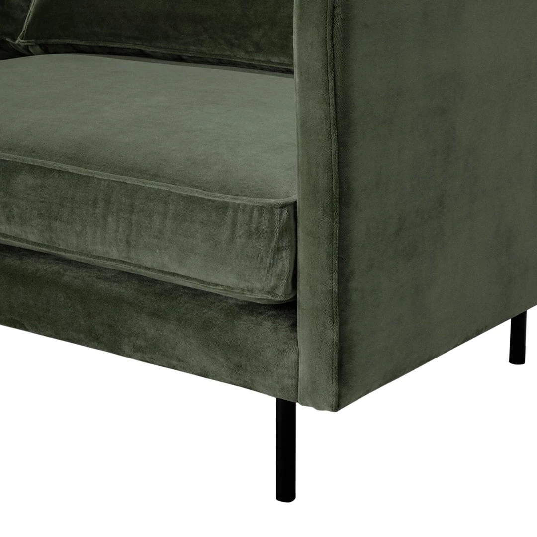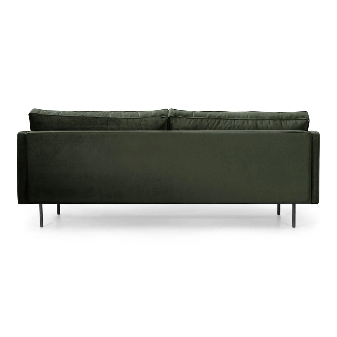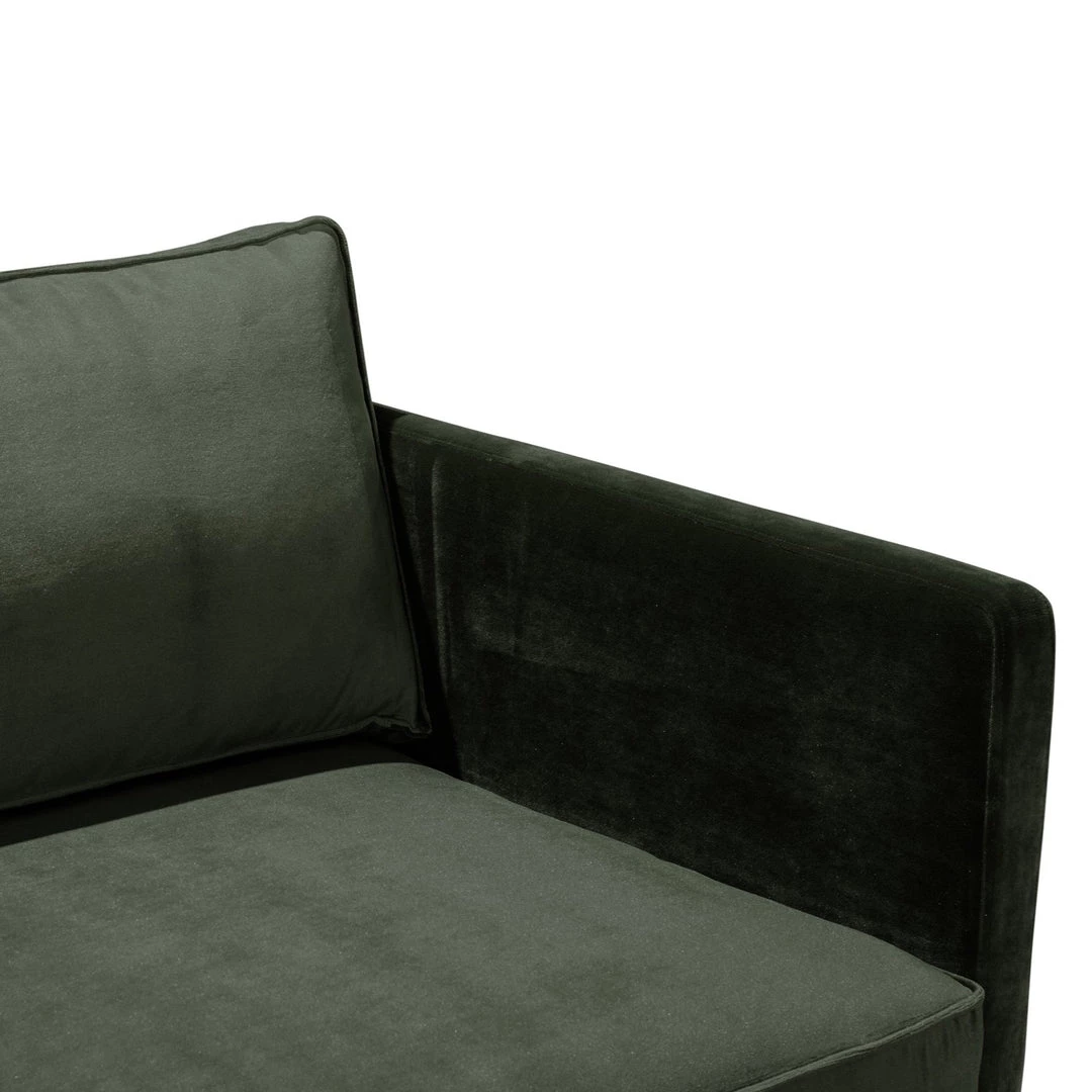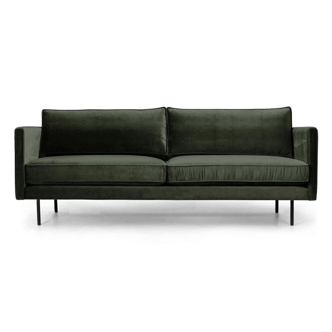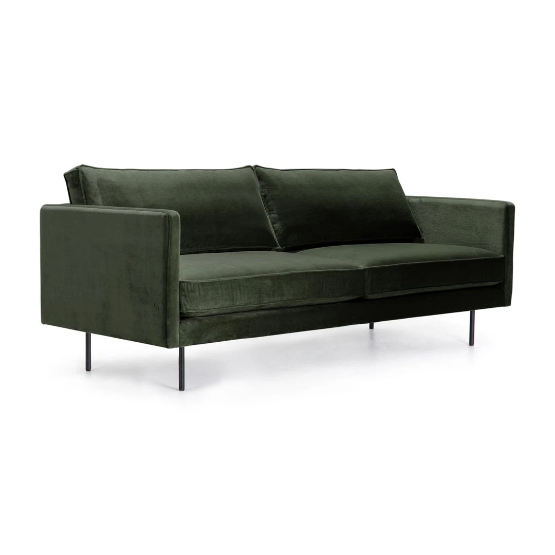 Straight forward mid-century styling adopts regality via plush forest-green upholstery. Soft velvet forms tailored lines with deep-set cushions while black-finished steel legs stand tall for a clean finishing touch.